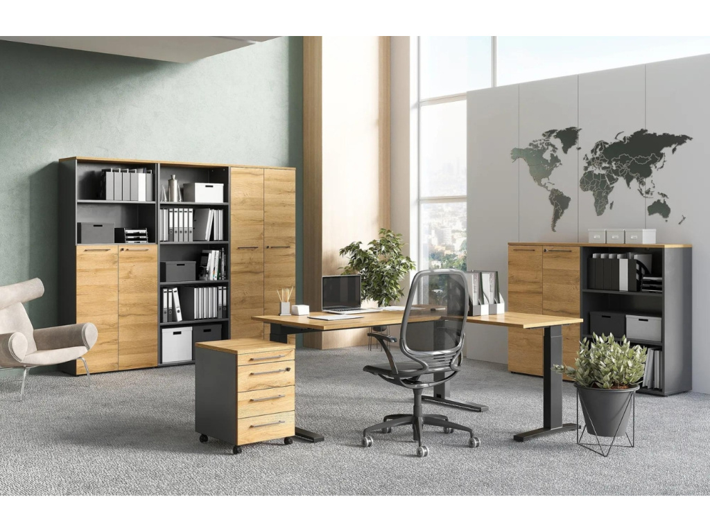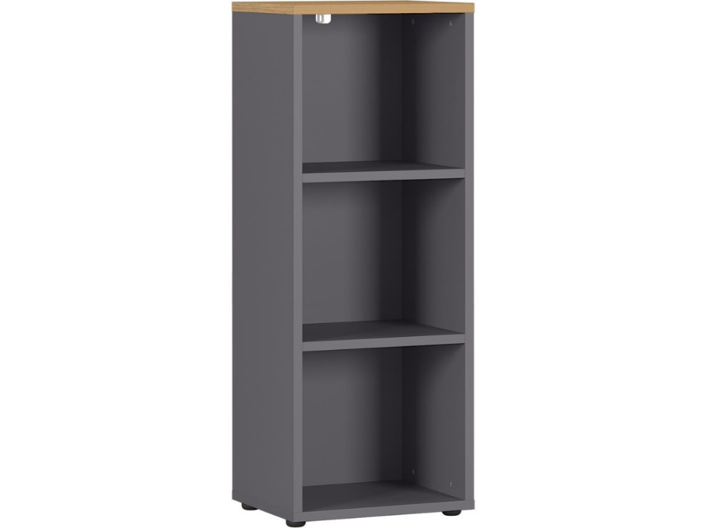 Moderní kancelářský regál Agenda od značky GERMANIA je perfektním kouskem do vaší kanceláře. Kombinace matné, grafitově šedé barvy laminátového korpusu a dubového dekoru na vrchní desce vytváří jemný a čistý vzhled, který do vašeho interiéru vnese nádech minimalistického designu. Prostorné úložiště zajišťují 3 otevřené police, díky čemuž pohodlně uložíte velké množství všeho inventáře. Otevřené police poskytují rychlý přístup k často používaným předmětům. Povrchová úprava korpusu z melaminové pryskyřice poskytuje nárazuvzdorný a vlhkosti odolný povrch. Díky nárazuvzdorným ABS hranám máte vyšší jistotu odolnosti, díky čemuž se skvěle hodí nejen do komerčních prostor, ale také do domácích pracoven. Radost také ale jistě udělá i jako praktická knihovna do moderního bytového prostoru. Doporučujeme kombinace všech produktů z řady Agenda.