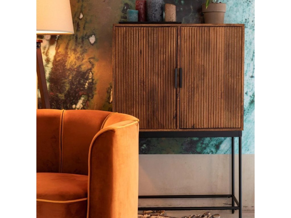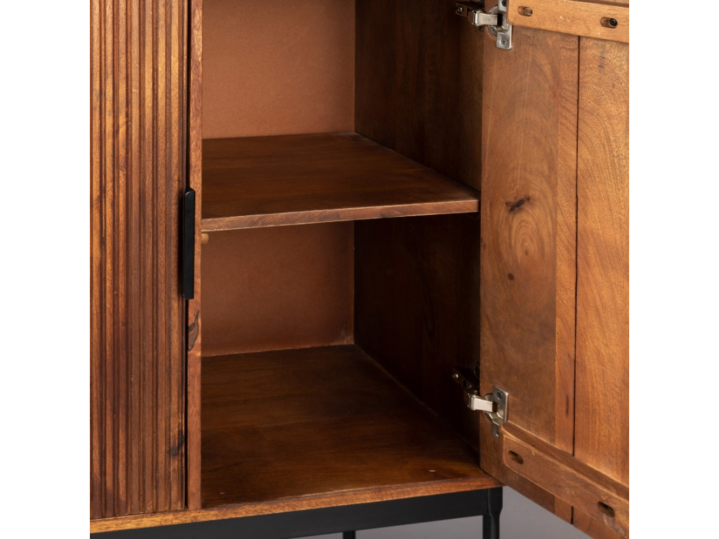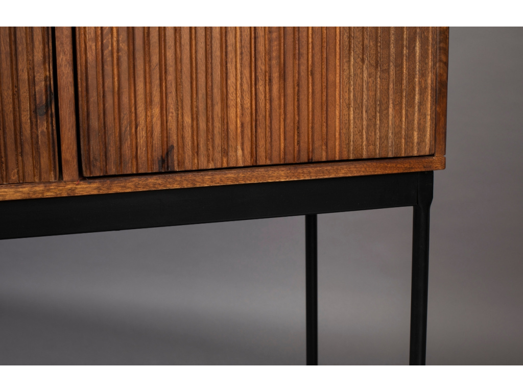 Elegantní série nábytku SAROO od nizozemské značky DUTCHBONE se line v duchu moderny a retra zároveň. Komoda představuje nadčasový kus nábytku, vyrobený z nesmrtelné kombinace dvou materiálů – dřeva a kovu. Mangové dřevo je na povrchu dvířek frézováno do svislých pruhů, které určují charakter celého kousku a dodávají mu vintage vzhled. Dvířka snadno otevírají pomocí jednoduchých kovových rukojetí, které se dřevem perfektně ladí. Komodu doplňuje stabilní kovová podnož, která jí dodává na eleganci a vzdušnosti. Obohaťte svůj interiér o tento jedinečný kus nábytku a slaďte ho s ostatními produkty ze stejnojmenné kolekce.