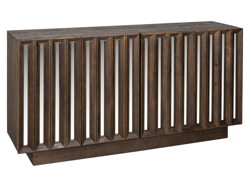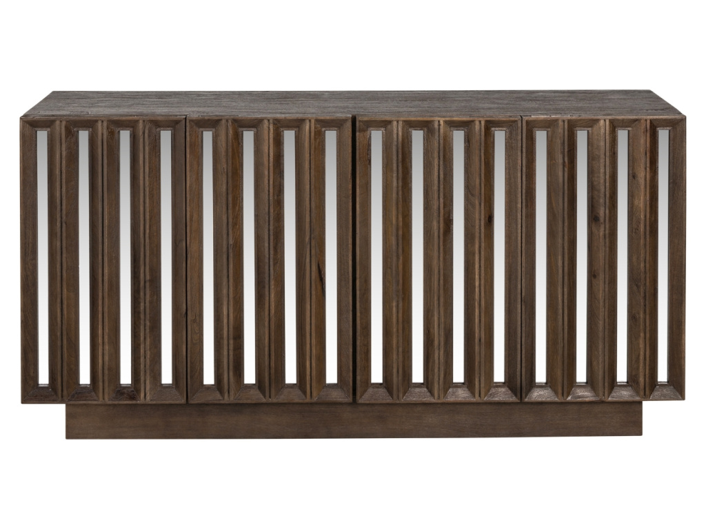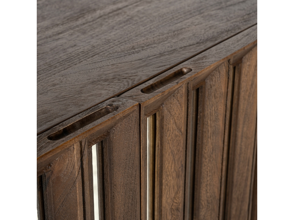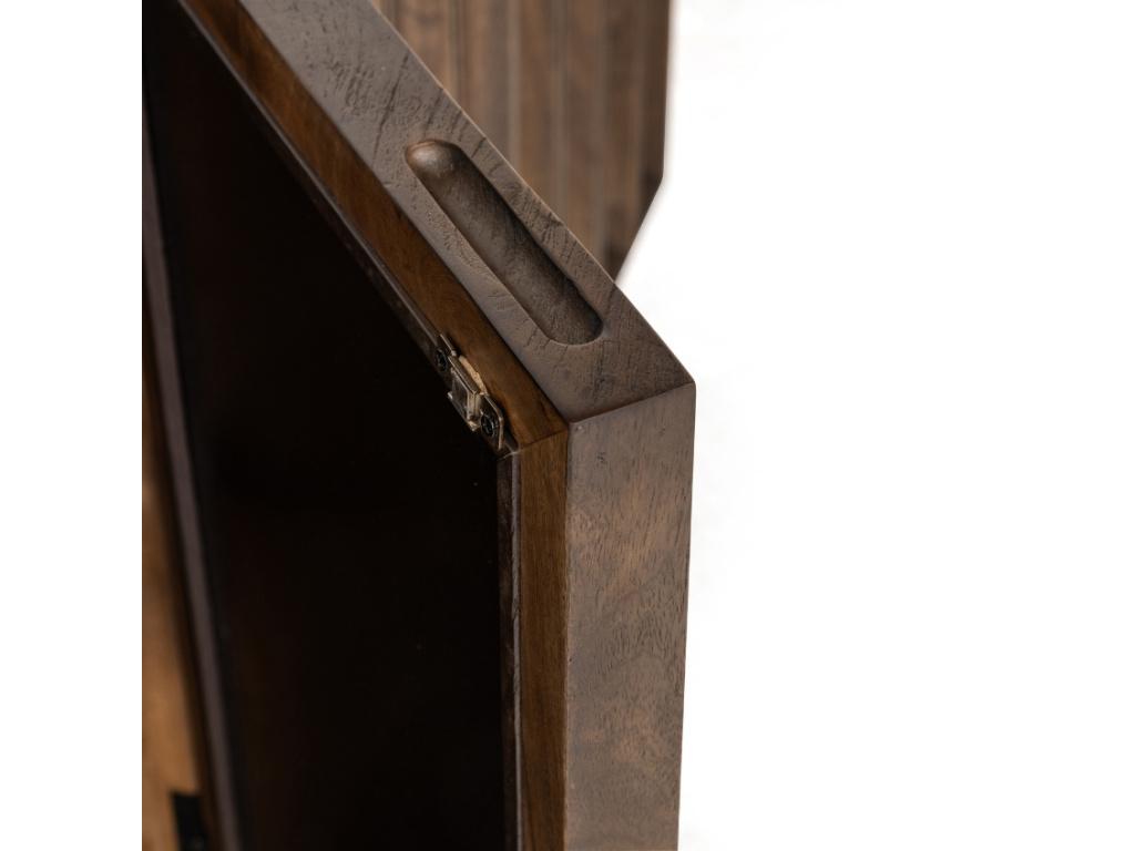 Komoda Bryant se stane nevšedním prvkem vašeho interiéru. Minimalistické zpracování z mangového dřeva je ozvláštněno o lamelový dekor dvířek prokládaný pruhy zrcadlového skla, které vytvářejí originální efekt. Komoda nabízí úložný prostor v podobě čtyř uzavřených polic. Pro sjednocení a doladění prostoru ji zkombinujte s dalšími kusy z řady Bryant od značky Richmond.