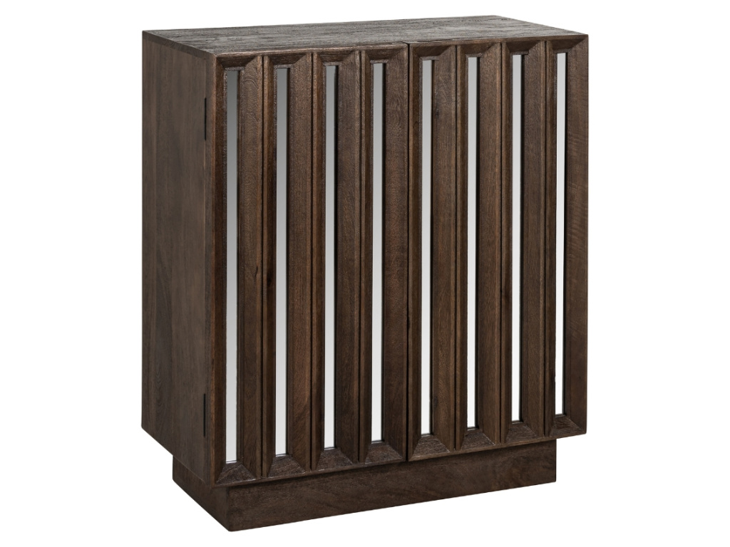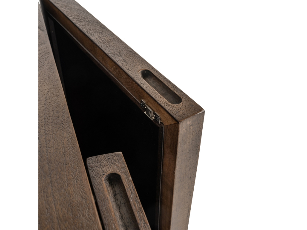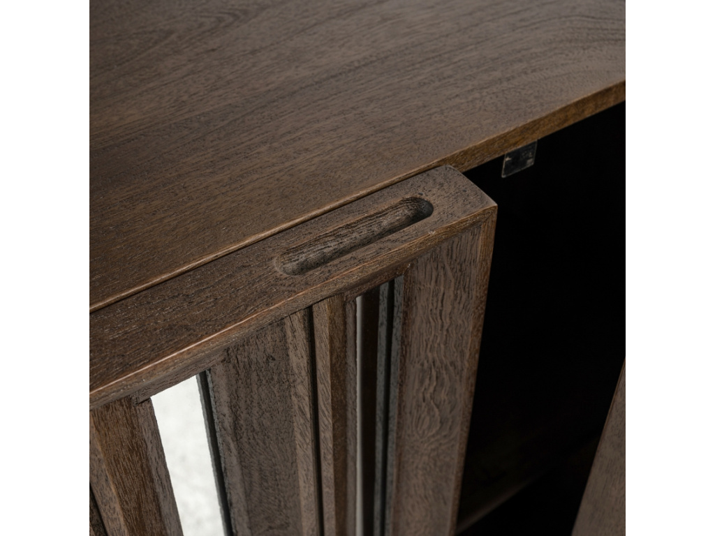 Komoda Bryant se stane nevšedním prvkem vašeho interiéru. Minimalistické zpracování z mangového dřeva je ozvláštněno o lamelový dekor dvířek prokládaný pruhy zrcadlového skla, které vytvářejí originální efekt. Komoda nabízí úložný prostor v podobě dvou uzavřených polic. Pro sjednocení a doladění prostoru ji zkombinujte s dalšími kusy z řady Bryant od značky Richmond.