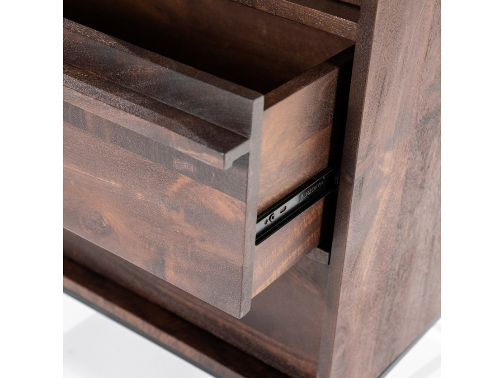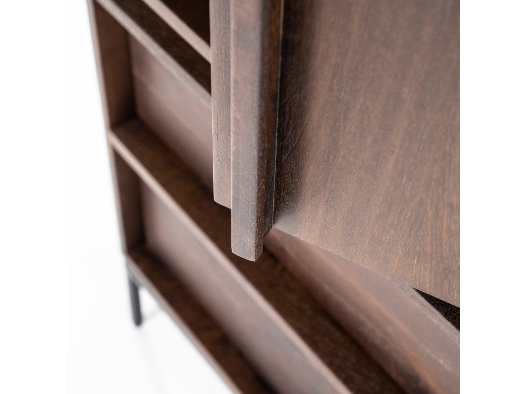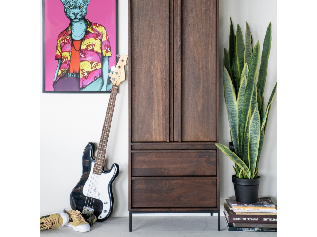 Dodejte svému interiéru styl se skříní Jimmy od značky Eleonora. Ta je vyrobena z mangového dřeva, které v kombinaci s černě lakovanou kovovou podnoží a minimalistickým designem vytváří lehký a elegantní dojem. Jimmy nabízí dostatek úložného prostoru díky čtyřem policím a dvěma zásuvkám, kam snadno uložíte vše potřebné – od oblečení po doplňky, knihy nebo elektroniku. Skvěle se hodí nejen do obývacího pokoje, ale také do ložnice nebo chodby. Pro jednotný vzhled interiéru můžete svou domácnost obohatit také o televizní stolek, komodu a skříň z kolekce Jimmy.