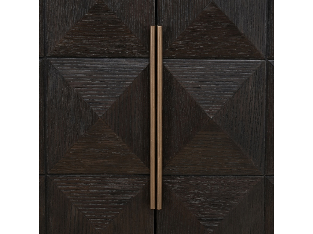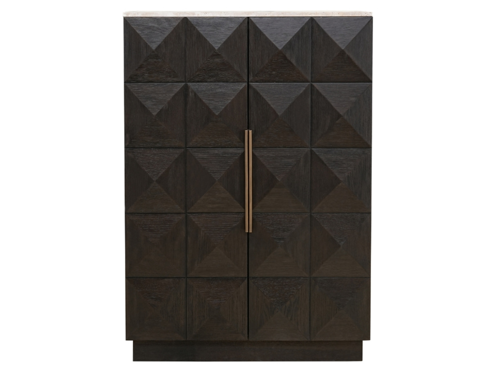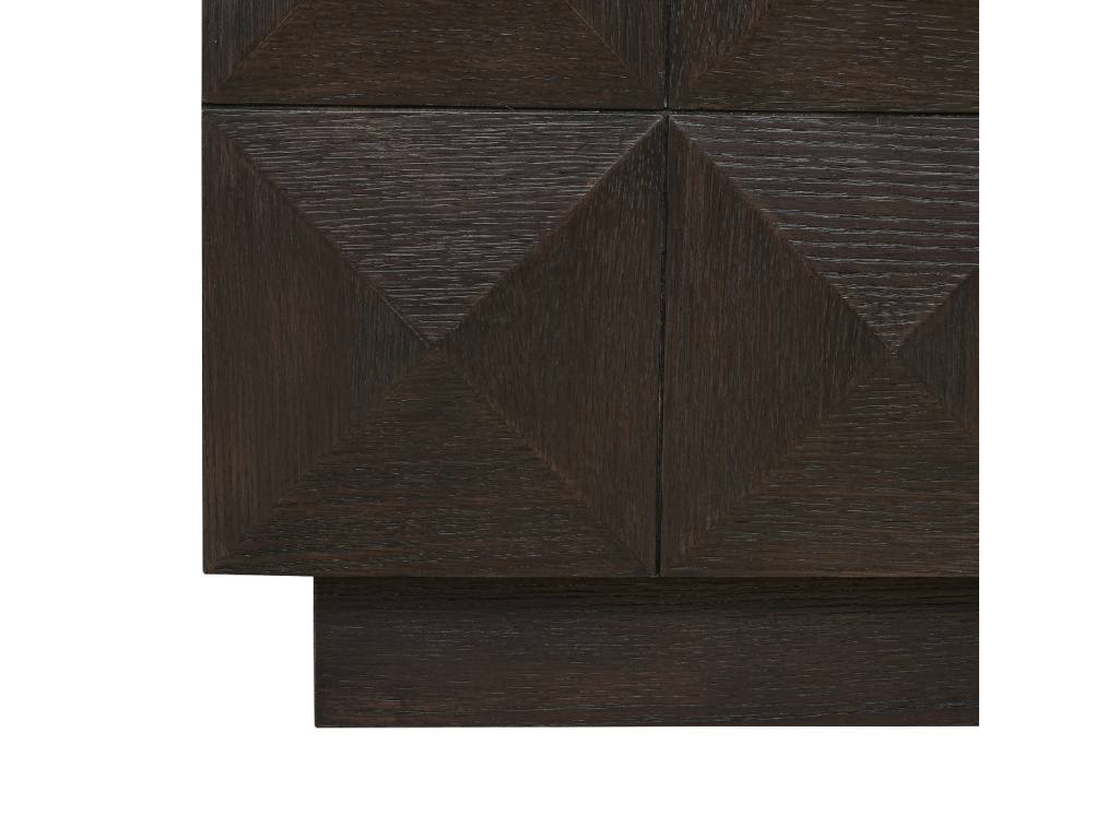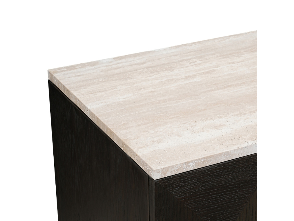 Elegantní dubová komoda z řady Claremont zaujme svým nevšedním pyramidovým dekorem. Robustní dřevěné provedení s deskou z přírodního béžového kamene a mosazné úchytky dodávají komodě luxusní vzhled. Praktické úložné prostory vám umožní snadno uspořádat věci a udržet váš domov přehledný. Doplňte komodu o další produkty z řady Claremont pro dokonalou harmonii vašeho prostoru.
