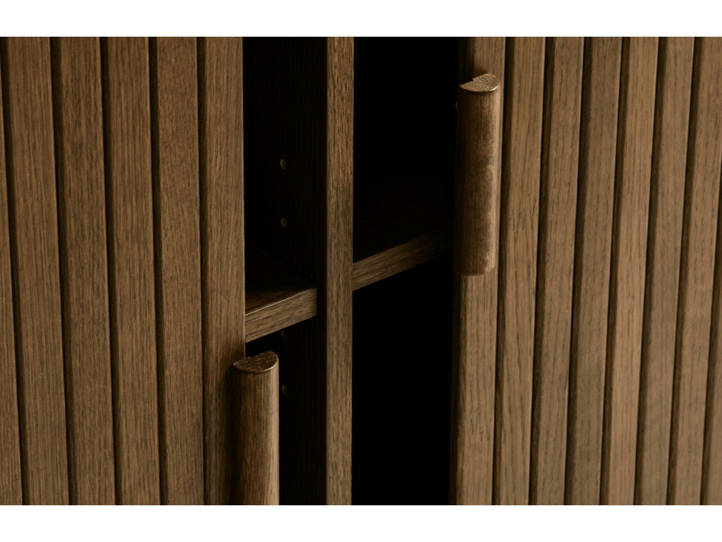 Komoda Cavo od značky Unique Furniture bude skutečným estetickým a praktickým kouskem vašeho interiéru. Je vyrobena z masivního dubového dřeva a dubové dýhy v hnědém provedení. Cavo disponuje praktickým úložným prostorem ve formě čtyř polic, které jsou ukryty za posuvnými dvířky. Nechte se okouzlit atraktivním hnědým odstínem dřeva a jednoduchým funkčním designem s promyšlenými detaily! Designový motiv žebrování podtrhne celkový dojem komody a dodá ji unikátní vzhled.