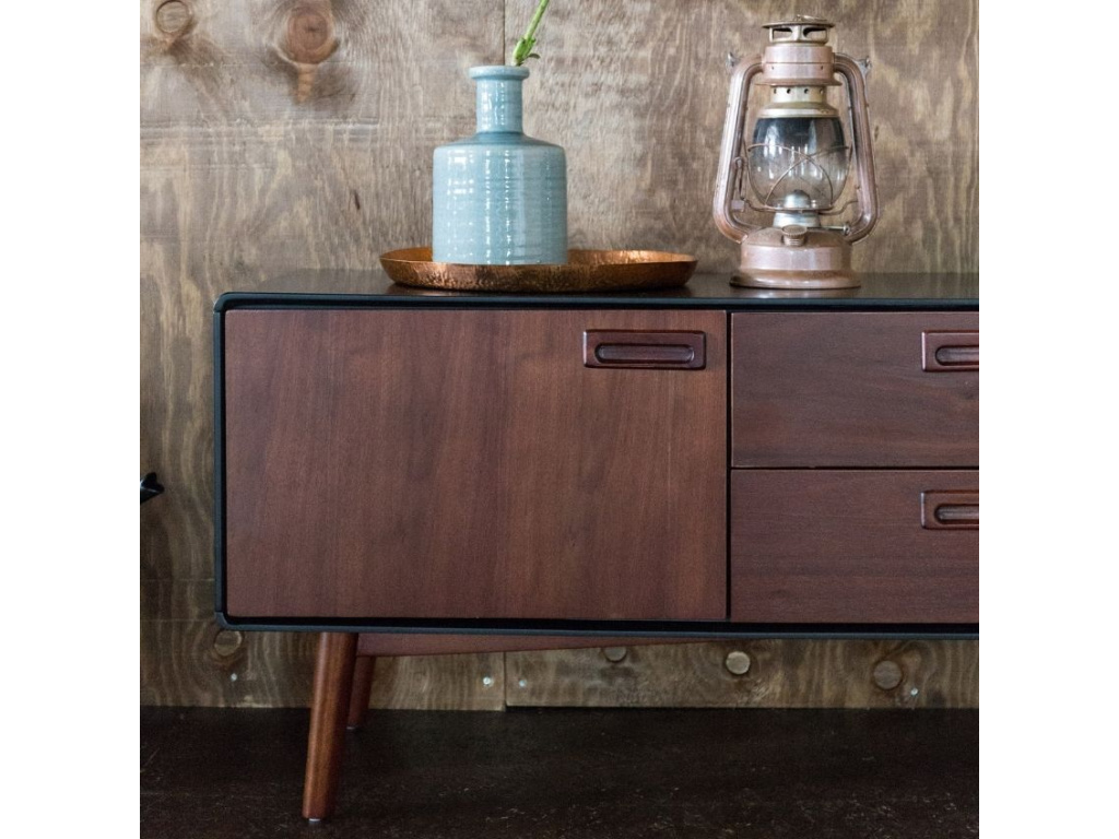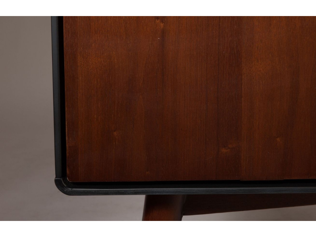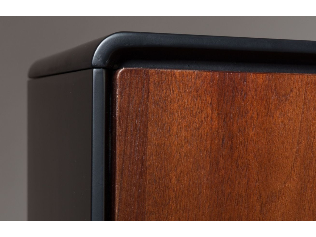 Dvířka a poličky z ořechové dýhy obklopené černým rámem z dřevovláknité desky přinášejí do všech interiéru nádech designu z 50. let minulého století. Tato nízká komoda se dvěma dvířky, dvěma poličkami v každé z nich, jednou zásuvkou a také jedním odkládacím prostorem poskytuje mnoho místa pro uložení jakýchkoliv věcí ve vaší domácnosti. Perfektní stabilitu komody Juju zajišťuje podnož z jasanového dřeva v barvě ořechu.