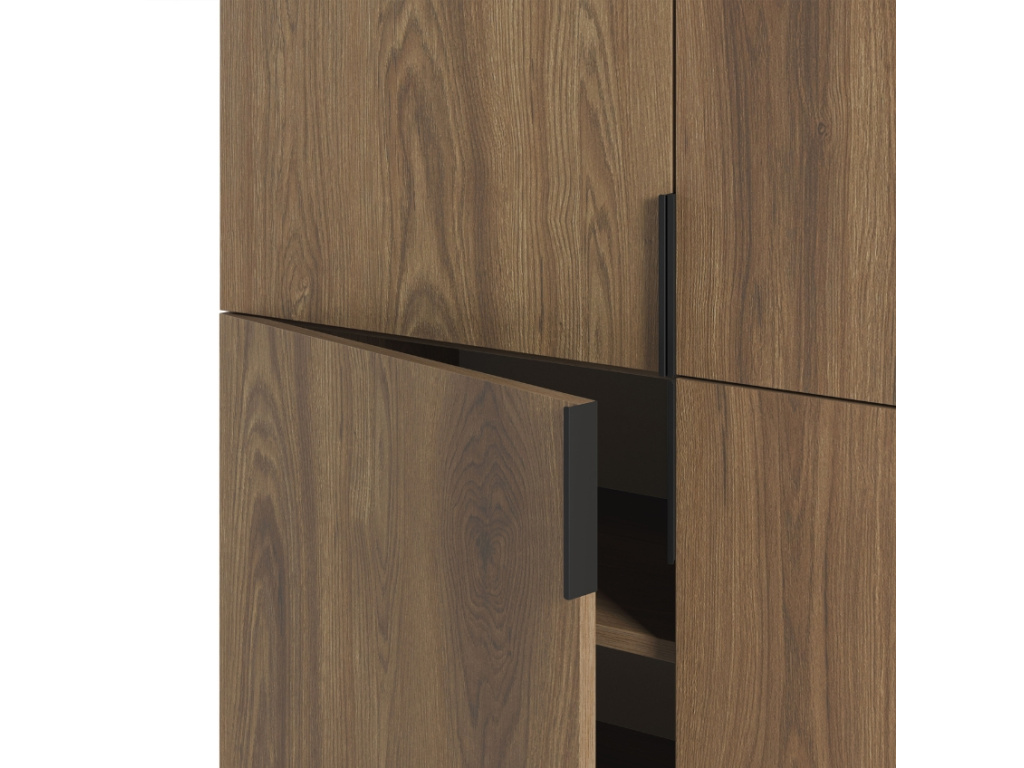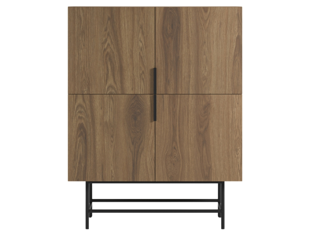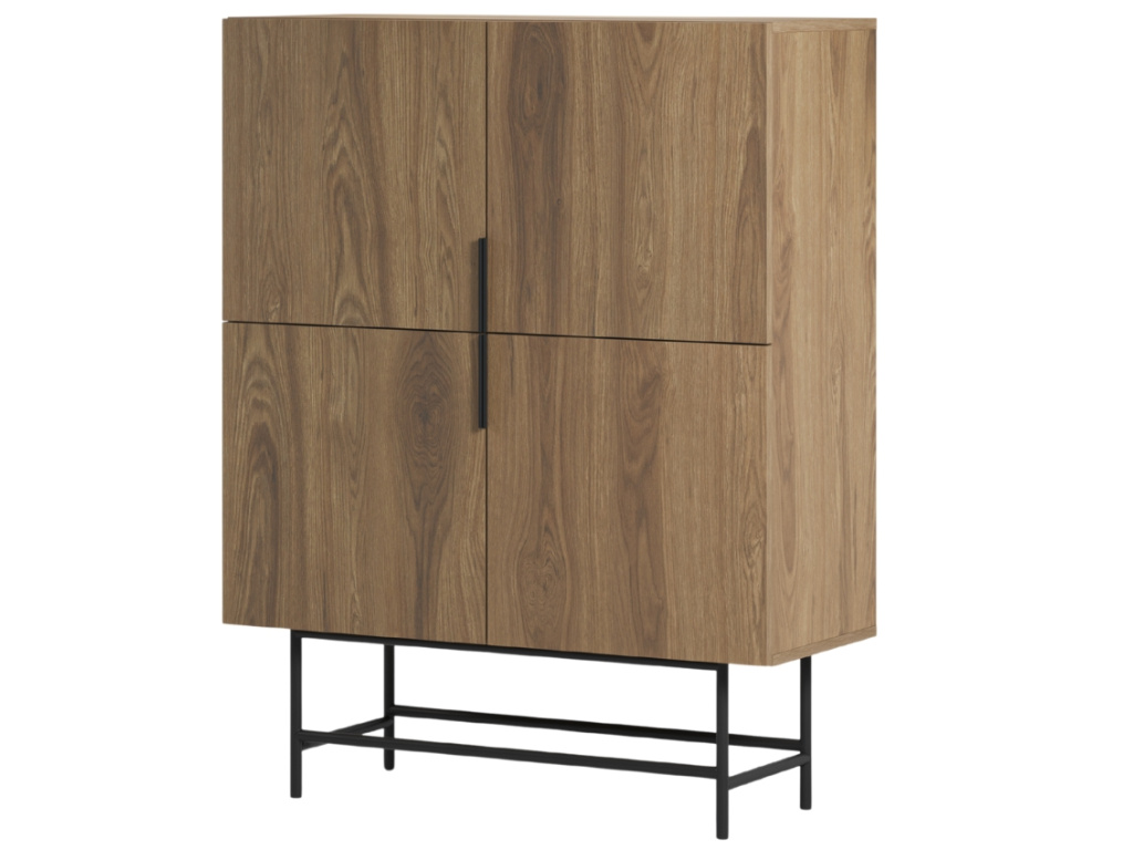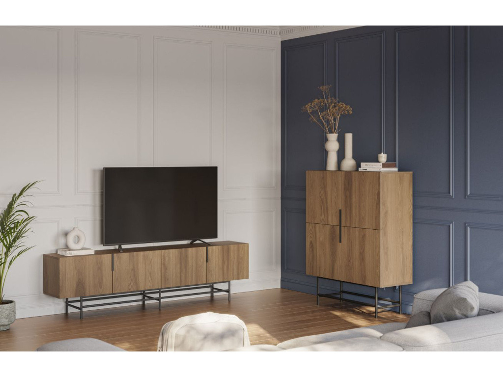 Komoda Eldia oslní minimalistickým designem v elegantním dubovém dekoru, který doplňuje černá kovová podnož a subtilní černé úchytky. Nábytek je vyroben z odolného laminátu, díky čemuž si zachovává pevnost a dlouhou životnost. Skvěle zapadne do skandinávských interiérů, kde vynikne svým dřevěným dekorem a lehkostí provedení. Kolekce Eldia nabízí více barevných variant a více kousků nábytku ke sladění – nízkou komodu, vysokou komodu a TV stolek.