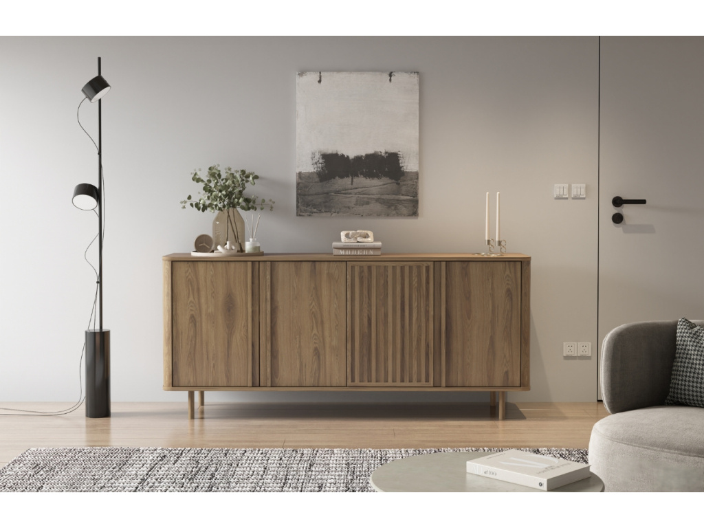 Komoda Salma od značky Marckeric přináší harmonii přírody a elegance díky věrné kresbě dubového dekoru. Středová dvířka s jemným vertikálním reliéfem dodávají nábytku výraz a rytmus, aniž by rušily jeho čistý vzhled. Za zavřenými dvířky se ukrývá prakticky členěný úložný prostor s policemi, který pomůže udržet váš domov v dokonalém pořádku. V kolekci Salma najdete tři varianty komod a TV stolek, které spolu krásně ladí.