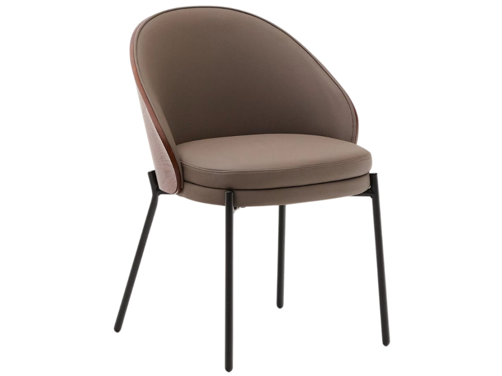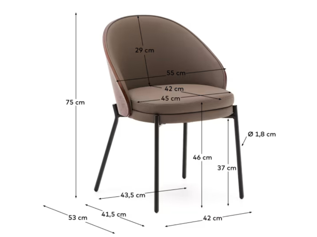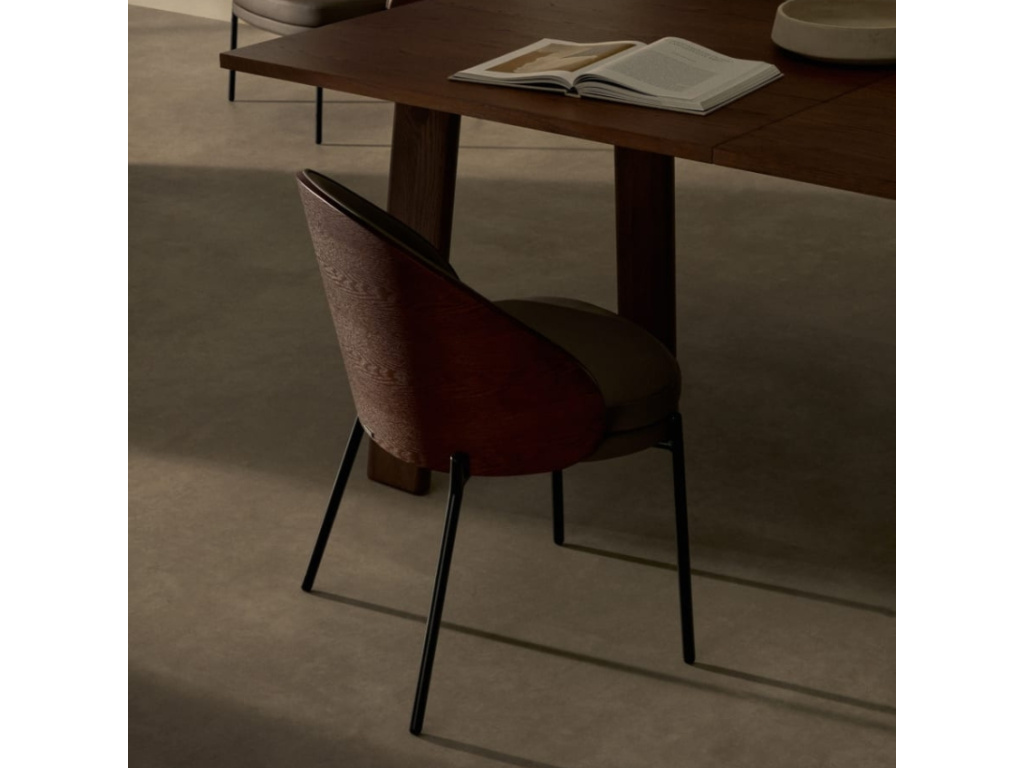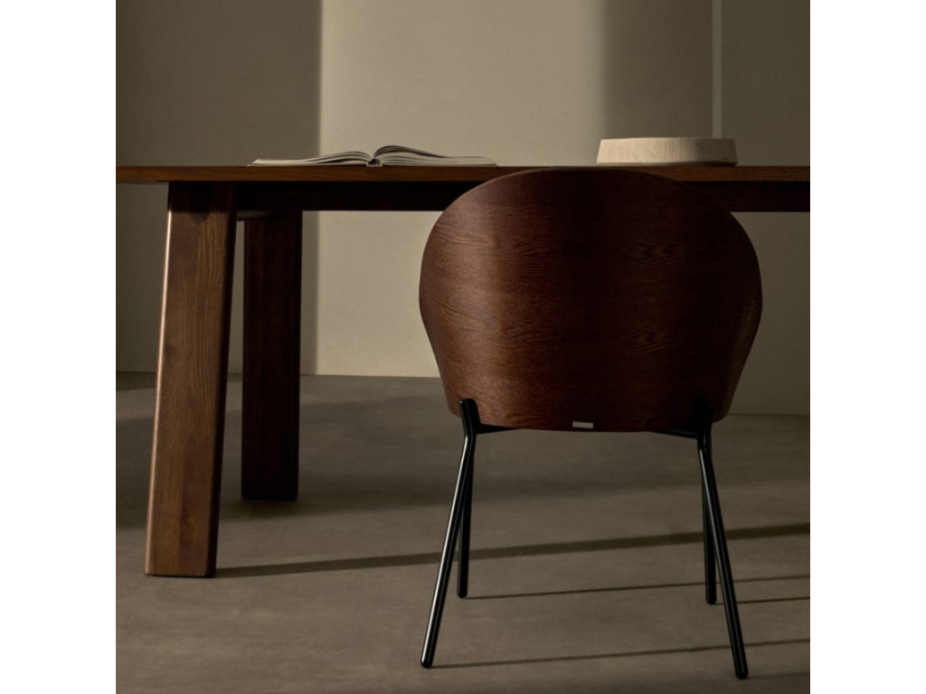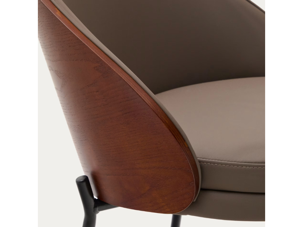 Židle Kave Home Eamy zaujme svým prostorným opěradlem, vyrobeným z jasanové dýhy v ořechovém dekoru s krásnou výraznou kresbou. Vkusně jej doplňuje čalounění z ekokůže hnědé barvy a štíhlá kovová podnož. Eamy bude u jídelního stolu nejen pohodlným místem k sezením, ale také designovým kouskem, který dodá celé místnosti styl. Umístit ji ale můžete také do pracovny nebo do studentského pokoje – bude skvělým parťákem při práci i učení!