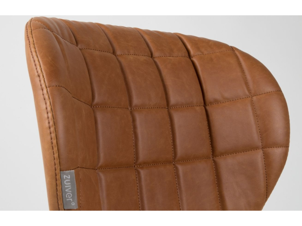 Elegantní vintage designová jídelní židle ZUIVER OMG LL. Základnu sedáku z umělé kůže v hnědé barvě tvoří překližka pokryta tenkou vrstvou pěny, díky které si budete moci vychutnat úžasné pohodlí, a to beze strachu pádu, které Vám zaručí pevná ocelová podnož v elegantním černém provedení.