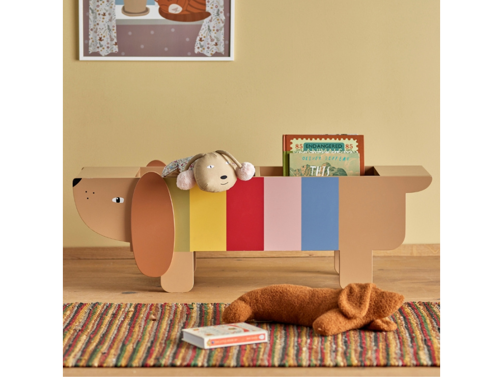 Oživte dětský pokoj kouzelnou knihovnou Charlie od dánské značky Bloomingville, která ho učiní útulnějším. Design v podobě roztomilého jezevčíka uvítá každý malý milovník zvířat. Hnědého pejska, vyrobeného z MDF, doplňují pestrobarevné pruhy, které do pokoje vnesou veselost a hravost. Knihovnu můžete umístit ke stěně i do prostoru, kde bude jedinečným doplňkem. Disponuje dvěma přihrádkami, kde najdete dostatek místa na uložení knížek, plyšových hraček a různých doplňků.
