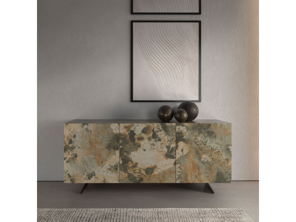 Tato elegantní komoda zaujme svým moderním designem, který kombinuje lakovaný povrch v taupe metalíze s detaily z porcelánového mramoru v zemitých a šedých tónech. Čisté linie a netradiční nerezová podnož dodají vašemu interiéru nádech současného stylu s jemným akcentem luxusu. Prostorné uzavíratelné police s měkkým zavíráním poskytnou dostatek místa pro organizaci nádobí, dekorací nebo osobních věcí. Tento designový kousek udrží vaše prostory uklizené a díky kombinaci materiálů a barev bude sloužit i jako výrazný vizuální prvek, který oživí každý moderní či industriálně laděný interiér.