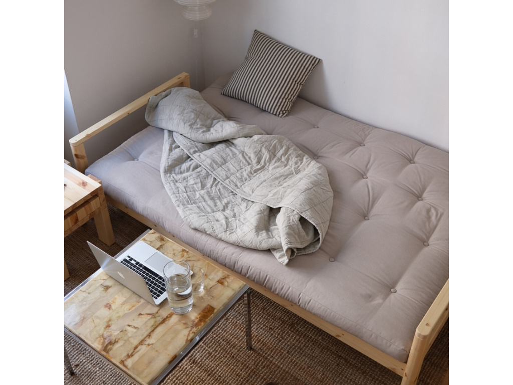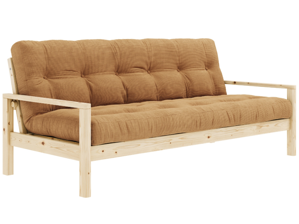 Pohovka nebo postel? Trojmístná rozkládací pohovka Knob od dánské značky Karup Design umí být obojím! Pod dřevěnými područkami se nachází dva nenápadné úchyty, které lze snadno odšroubovat a vy tak během chvilky získáte pohodlné lůžko pro vás nebo vaše hosty. Konstrukce z masivního borovicového dřeva s FSC certifikací je doplněna kvalitní 14cm futonovou matraci, která v sobě kombinuje recyklovaná vlákna a 4 cm pěny. Pohovka Knob fantasticky zapadne do skandinávských a japonských stylů interiérů, do kterých vnese jednoduchost, eleganci a ryzí funkčnost. Představuje skvělé řešení zejména pro menší prostory, do kterých přinese další místo na spaní. Vybrat si ji můžete v další barvě konstrukce či v mnoha barvách matrací.