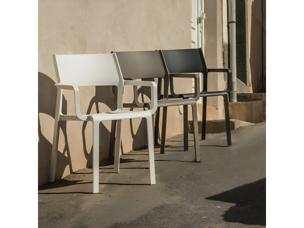 Designová jídelní židle Trill zaujme na první pohled svou jednoduchostí. Je vyrobena z odolného a lehkého polypropylenu, který je vyztužený skelným vláknem s vysokou odolností proti UV záření, díky čemuž se židle stává ideálním prvkem do venkovního prostředí. Její nadčasový design se bude skvěle hodit nejen na zahrady, ale také do komerčních prostor. Její výhodou jsou pohodlné područky a její stohovatelnost, což oceníte při rychlém a snadném úklidu většího počtu židlí. Židle je k dispozici v několika barevných variantách a můžete ji doplnit barovými židlemi, židlemi bez područek nebo podsedákem ze stejnojmenné série.