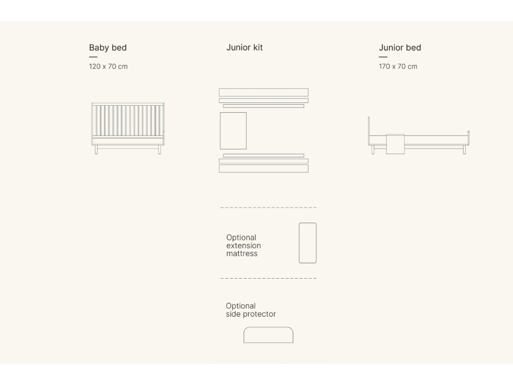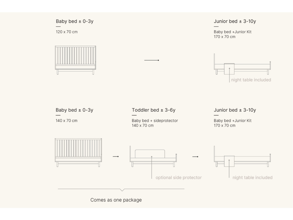 Vsaďte na udržitelnost a investujte do budoucnosti – díky postelím od značky Quax, které jsou navržené v konceptu Good to Grow, může mít vaše dítě stejnou postel od narození až do školních let. S touto sadou snadno přestavíte dětské postýlky Quax Kyo (70 × 120 nebo 70 × 140 cm) na dětskou postel 70 × 170 cm. V setu kromě prodlužovací části k posteli najdete i praktický noční stolek. A pokud chcete pro své dítě extra bezpečí, doporučujeme k této sadě pořídit také bezpečnostní zábranu Quax Ashi, usnadníte tak vašemu dítěti přechod z postýlky na otevřené lůžko.