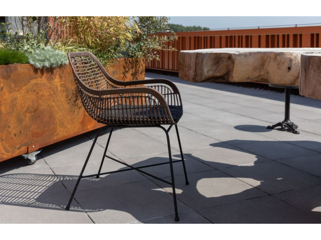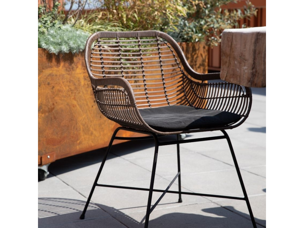 Krása ratanové zahradní židle DUTCHBONE Cantik vyobrazena v její tmavě hnědé barvě. Díky tomuto provedení je jídelní židle přátelštější k životnímu prostředí. Zaujme vás především jednoduchost a elegance v synchronizaci s černě lakovanou kovovou podnoží s gumovými kluzáky chránícími vaší podlahu před poškrábáním. Díky této židli budou chvíle na vaší zahradě či terase výjimečné. Jako doplněk jistě zaujme i příjemný měkký podsedák, který je součástí balení.