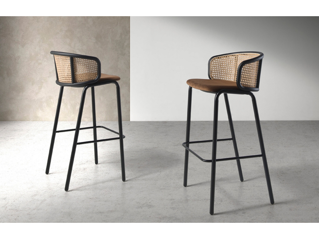 Barová židle Angel Cerdá spojuje moderní design s komfortem a stylem. Hnědé sametové čalounění sedáku a přírodní ratanové opěradlo vytvářejí jedinečný kontrast, který doplní každou jídelnu i kuchyni. Konstrukce a podnože z černé nerezové oceli dodávají židli nadčasový a avantgardní vzhled. Tento elegantní kousek nabízí maximální pohodlí –bude perfektní volbou pro ty, kteří chtějí do svého interiéru vnést nádech elegance a moderního designu.