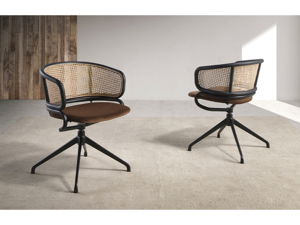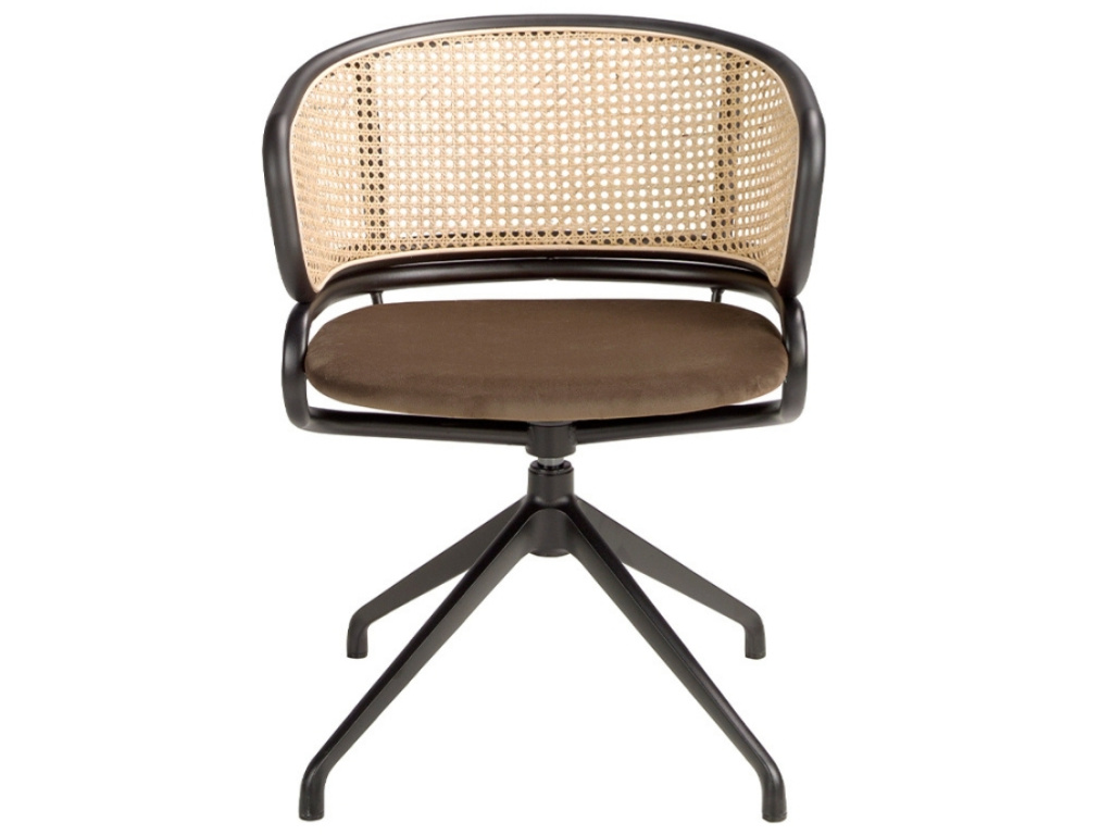 Otočná židle Angel Cerdá spojuje moderní design s komfortem a stylem. Hnědé sametové čalounění sedu a přírodní ratanové opěradlo vytvářejí jedinečný vzhled, který doplní každou jídelnu či kuchyni. Konstrukce a podnože z černé nerezové oceli dodávají židli nadčasový a avantgardní vzhled. Tento elegantní kousek nabízí maximální pohodlí díky kvalitnímu čalounění a praktickým područkám. Perfektní volba pro ty, kteří chtějí do svého interiéru vnést nádech elegance a moderního designu.
