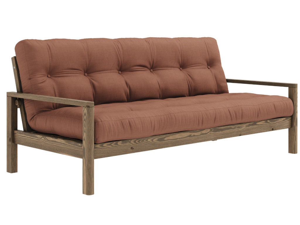 Pohovka nebo postel? Trojmístná rozkládací pohovka Knob od dánské značky Karup Design umí být obojím! Pod dřevěnými područkami se nachází dva nenápadné úchyty, které lze snadno odšroubovat a vy tak během chvilky získáte pohodlné lůžko pro vás nebo vaše hosty. Konstrukce z masivního borovicového dřeva s FSC certifikací je doplněna kvalitní 14cm futonovou matraci, která v sobě kombinuje recyklovaná vlákna a 4 cm pěny. Pohovka Knob fantasticky zapadne do skandinávských a japonských stylů interiérů, do kterých vnese jednoduchost, eleganci a ryzí funkčnost. Představuje skvělé řešení zejména pro menší prostory, do kterých přinese další místo na spaní. Vybrat si ji můžete v další barvě konstrukce či v mnoha barvách matrací.