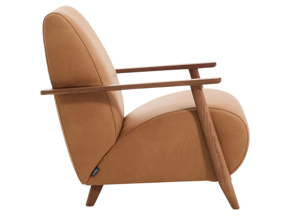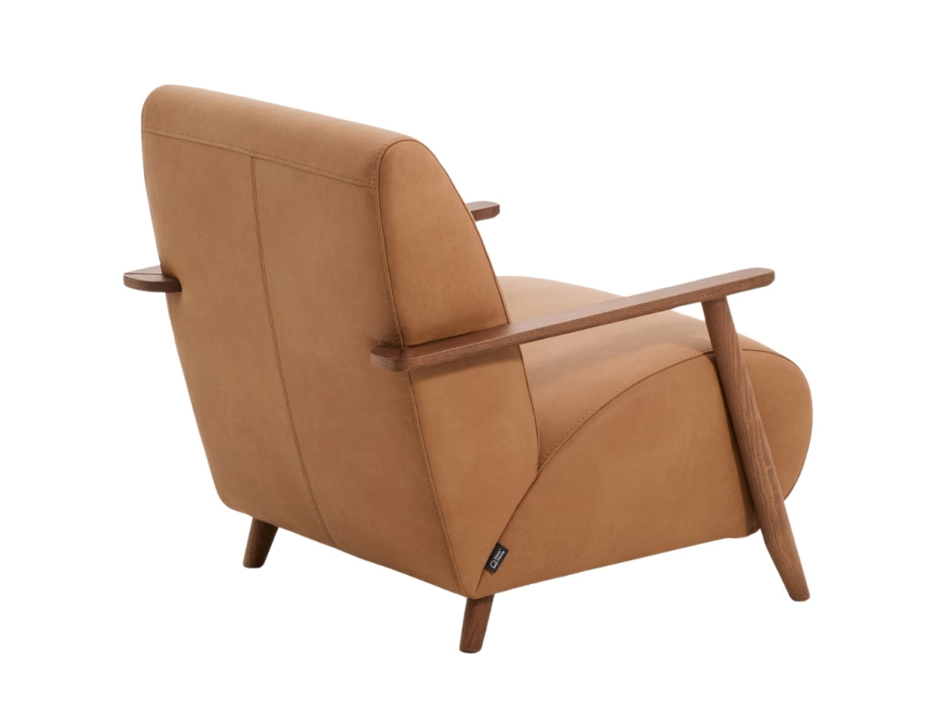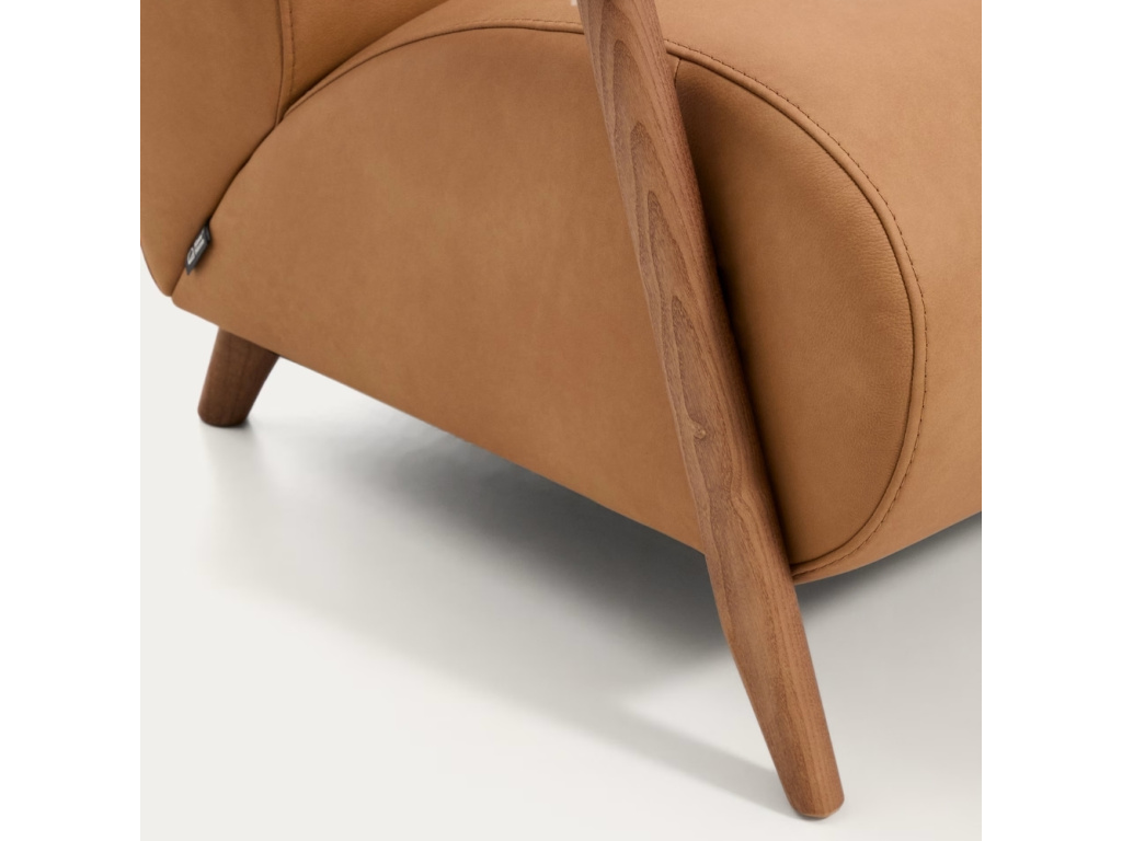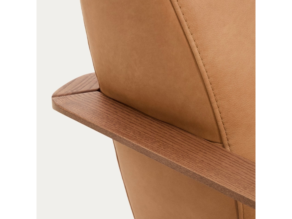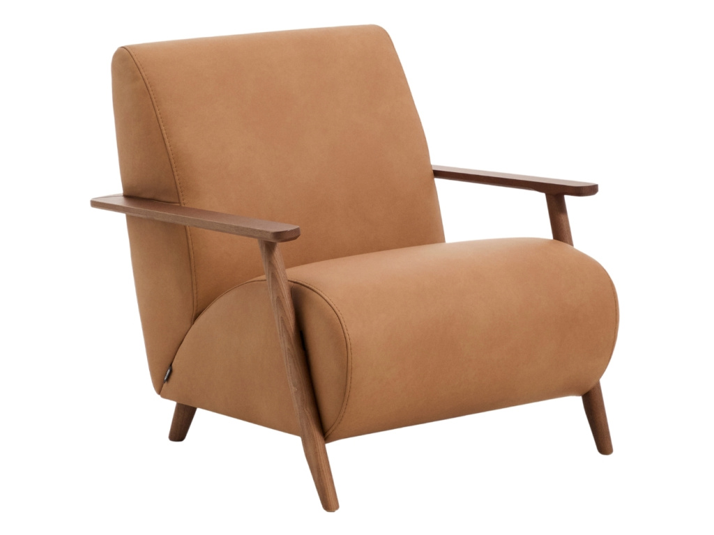 Křeslo Meghan je čalouněné extra měkkou italskou telecí kůží s přírodní kresbou a povrchovou úpravou nuvolatura, která dodává kůži jedinečný rustikální charakter a hloubku tónu. Konstrukci tvoří masivní jasanové dřevo s povrchovou úpravou v odstínu ořechu. Odhalené dřevěné části v kombinaci s měkkými liniemi čalounění vytvářejí harmonii mezi robustností a lehkostí. Kůže je činěna v závodech využívajících obnovitelné zdroje energie, s recyklací vody a přírodními barvivy bez PFC, a pochází od dodavatele s prestižní certifikací Leather Working Group – Gold, která garantuje odpovědné a ekologické zpracování. Dřevo má certifikaci FSC™ Mix Credit – pochází z udržitelných a kontrolovaných zdrojů. Meghan je víc než jen křeslo – je to ikonický kus nábytku, který propojuje komfort, udržitelnost a design s duší.