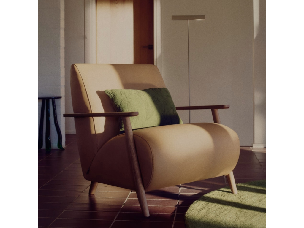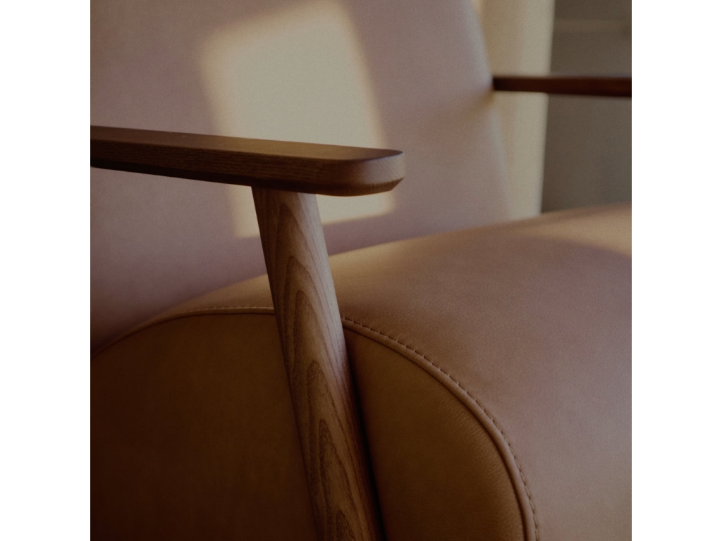 Křeslo Meghan je čalouněné extra měkkou italskou telecí kůží s přírodní kresbou a povrchovou úpravou nuvolatura, která dodává kůži jedinečný rustikální charakter a hloubku tónu. Konstrukci tvoří masivní jasanové dřevo s povrchovou úpravou v odstínu ořechu. Odhalené dřevěné části v kombinaci s měkkými liniemi čalounění vytvářejí harmonii mezi robustností a lehkostí. Kůže je činěna v závodech využívajících obnovitelné zdroje energie, s recyklací vody a přírodními barvivy bez PFC, a pochází od dodavatele s prestižní certifikací Leather Working Group – Gold, která garantuje odpovědné a ekologické zpracování. Dřevo má certifikaci FSC™ Mix Credit – pochází z udržitelných a kontrolovaných zdrojů. Meghan je víc než jen křeslo – je to ikonický kus nábytku, který propojuje komfort, udržitelnost a design s duší.