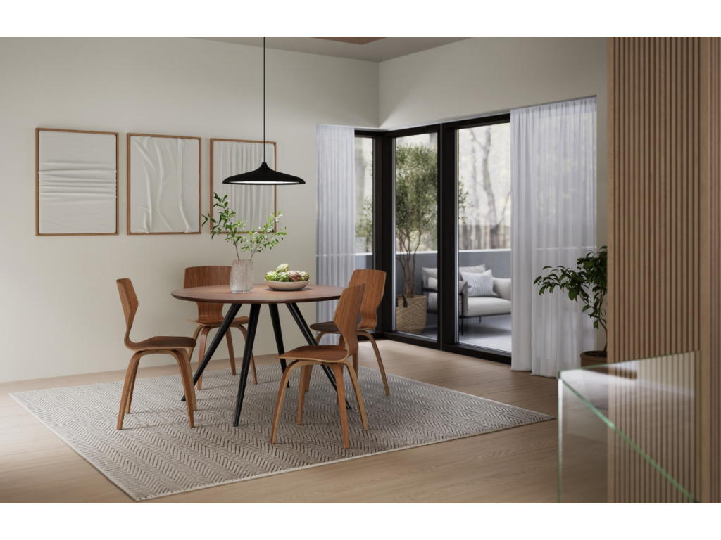 Designový jídelní stůl Eclipse má desku vyrobenou z lakované jasanové dýhy, která zaujme svým zajímavým hnědo šedým zbarvením. Kulatý tvar desky je doplněn o jednoduchou kovovou podnož, která je tvořena čtyřmi štíhlými elegantními nohami. Stůl Eclipse je nadčasovým kouskem, který bude slušet moderním i klasickým interiérům a vytvoří perfektní duo se židlemi od firmy DAN-FORM.