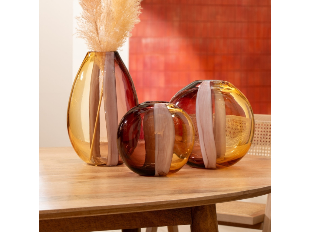 Objevte kouzlo jemné elegance se skleněnou vázou Amberis od značky J-line! Tento designový kousek zaujme svou siluetou, kterou doplňuje rafinovaný barevný akcent v hnědém a žlutém odstínu. Výsledkem je harmonická souhra průhlednosti a barvy, která vynikne v každém interiéru. Ať už do ní naaranžujete svěží květiny nebo ji necháte vyniknout samostatně, vždy dodá prostoru lehkost a styl. Kombinujte různé velikosti a tvary z této kolekce a vneste do svého domova hravost i nadčasovou krásu, které si všimne každá návštěva