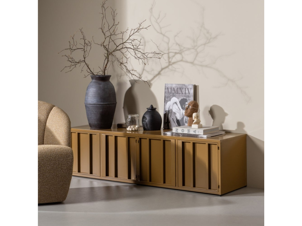 TV stolek Lavene je designový kousek, který přinese do vašeho obývacího pokoje hravý šmrnc i funkční řešení. Jeho kovová konstrukce v medově hnědém odstínu zaujme na první pohled a dodá prostoru svěží, moderní akcent. Nabízí dostatek místa nejen pro televizi, ale i pro dekorace, knihy nebo elektroniku. Lavene je perfektní volbou pro ty, kdo chtějí spojit minimalistický styl s barvami a originálním designem.