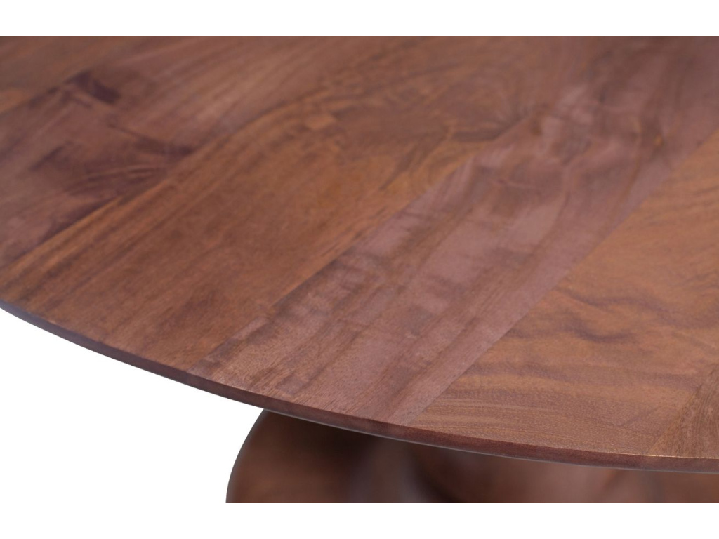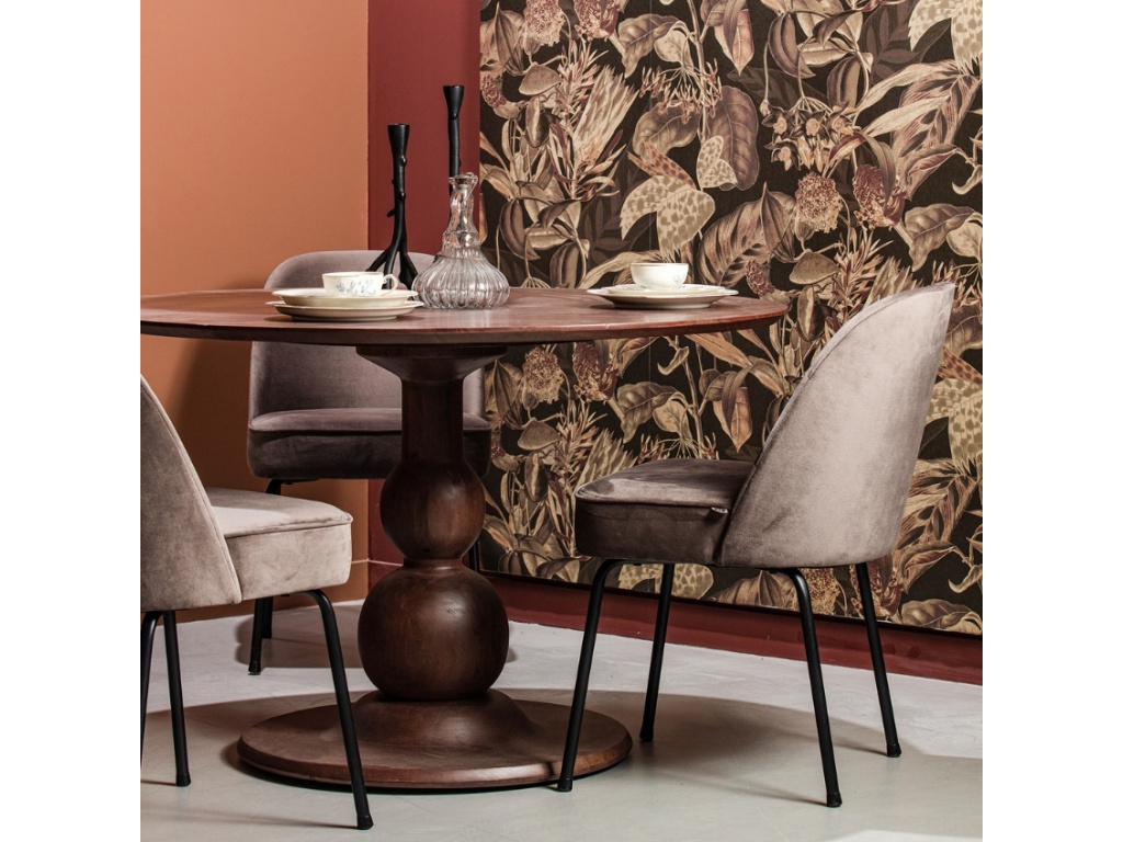 Masivní kulatý jídelní stůl Boyle 120 cm zaujme na první pohled svou elegantní kulovitou podnoží. Hnědá deska za mangového dřeva v ořechovém odstínu vytváří společně s podnoží vizuálně atraktivní spojení, které k sobě okamžitě přitáhne pozornost. Stůl se skvěle hodí do moderních i klasických prostor.
