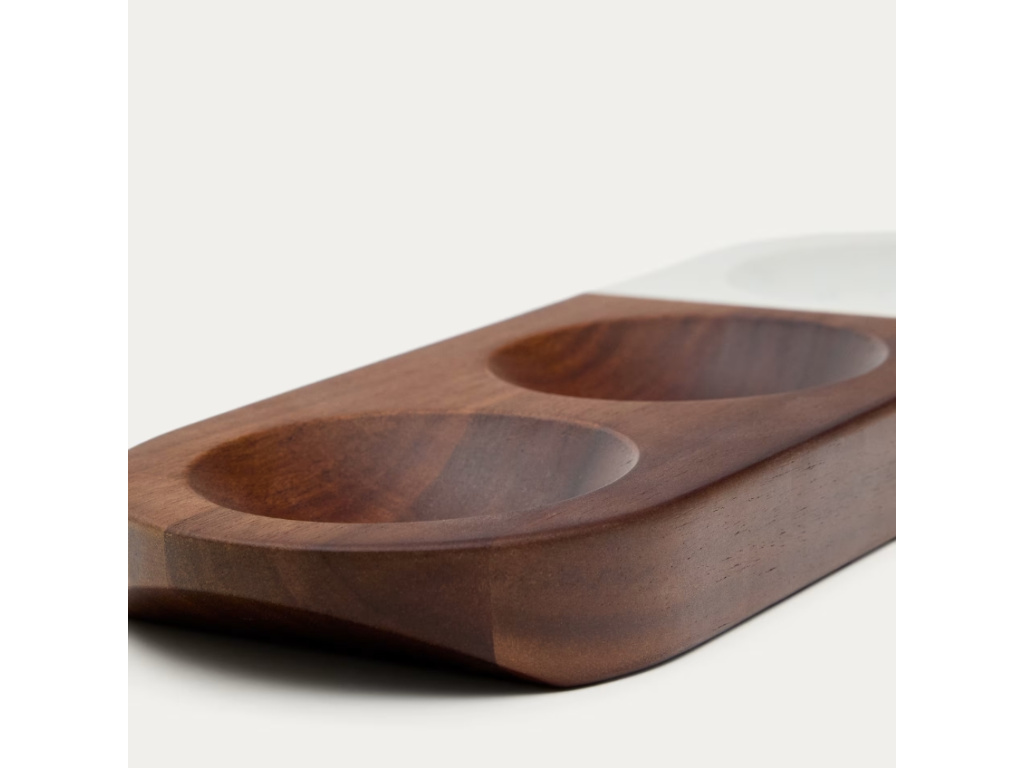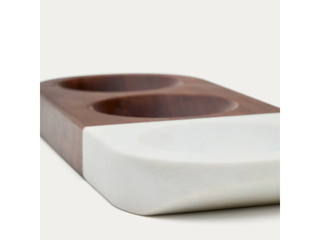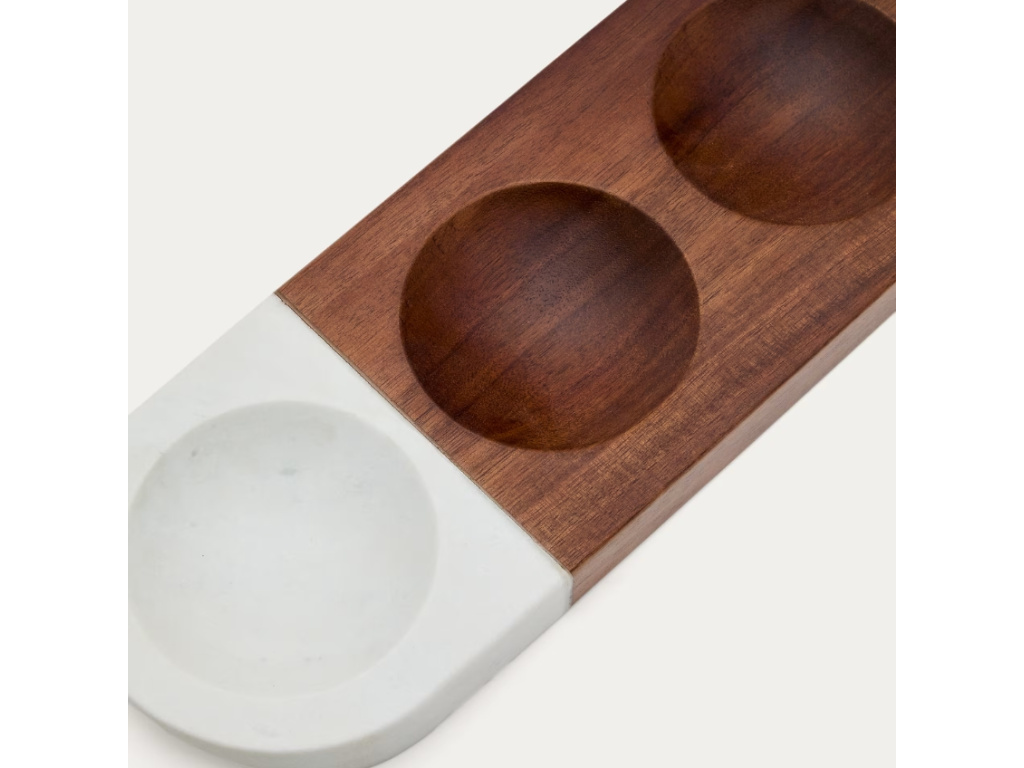 Talíř Tori využijete k naservírování drobných pochutin, jako jsou oříšky a semínka. Je rozdělen na tři stejně velké mističky, které vám pomohou oddělit jednotlivé druhy dobrot. Talíř je tvořený kombinací akátového dřeva a bílého mramoru, výsledkem čehož je velice elegantní a originální kousek.