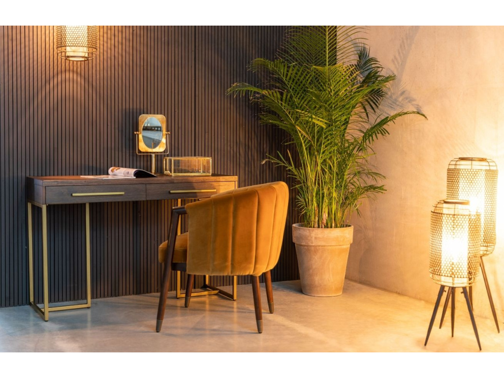 Hnědý toaletní stolek Class je tvořen dřevěnou deskou a elegantní podnoží v mosazném odstínu ve stylu vintage. Vrchní část stolu se vzorem rybích kostí je vyrobena z polotvrdé dřevovláknité desky, kterou z obou stran pokrývají tenké desky z akátové dýhy. Podnož je zakončena gumovými podložkami chránícími vaší podlahu před poškrábáním. Stolek můžete skvěle doladit s dalšími kousky ze série DUTCHBONE CLASS.