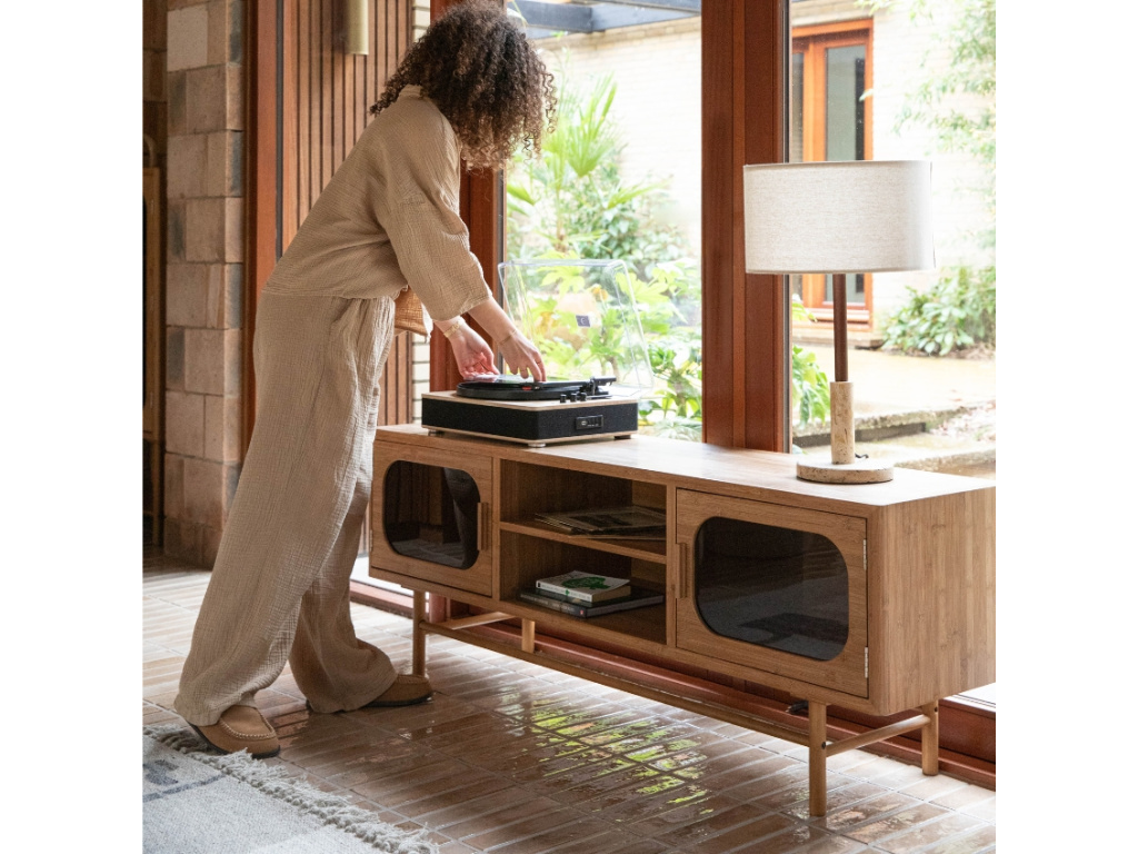 Jednoduchost a čistota designu TV stolku CAROUN od značky DUTCHBONE nadchne nejednoho obdivovatele moderního minimalismu. Stolek je vyrobený z bambusového dřeva a skla zbarveného do šedých kouřových odstínů. CAROUN nabízí prostorné úložiště v podobě čtyř polic, které využijete nejen v obývacím pokoji, ale i v chodbě nebo ložnici. Nechte se okouzlit spojením krásy přírodního odstínu dřeva a jednoduchým, funkčním designem s promyšlenými detaily! Pokud toužíte po dokonale sjednoceném interiéru, doporučujeme vitrínu doplnit dalšími produkty ze série CAROUN.