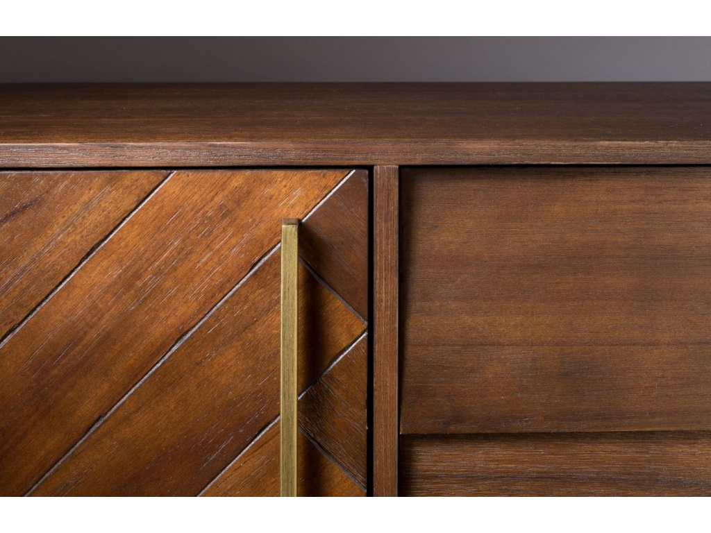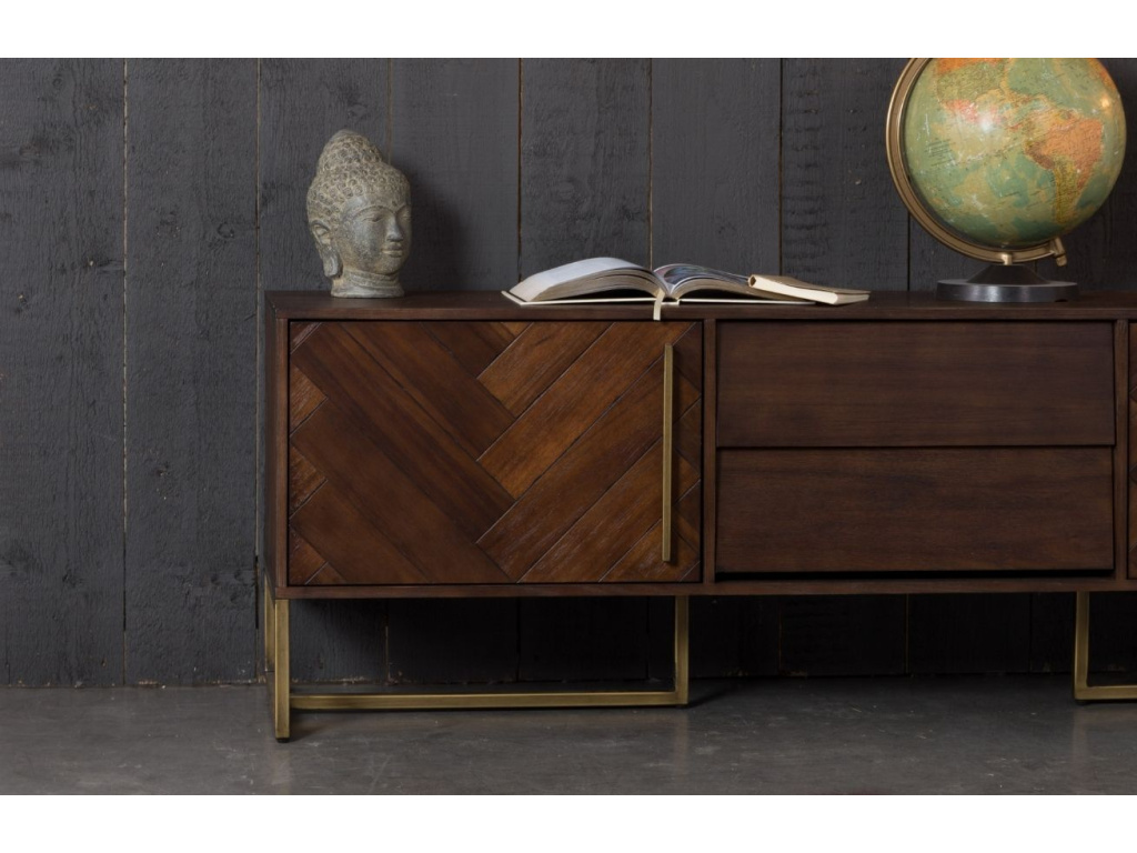 TV stolek Class značky DUTCHBONE je navržen ve vintage stylu a je opatřen elegantní kovovou podnoží v mosazné barvě. Korpus se vzorem rybích kostí je vyroben z akátové dýhy a je doplněn štíhlými kovovými úchytkami. Díky dvěma odklápěcím policím a dvěma bočním skříňkám vzniká prostorné úložiště, které jistě oceníte. Samozřejmostí je otvor na kabely, který využijete při zapojování herních konzolí a přehrávačů. V sérii produktů Class najdete komody a stoly různých velikostí, které vám pomohou dokonale sladit interiér.