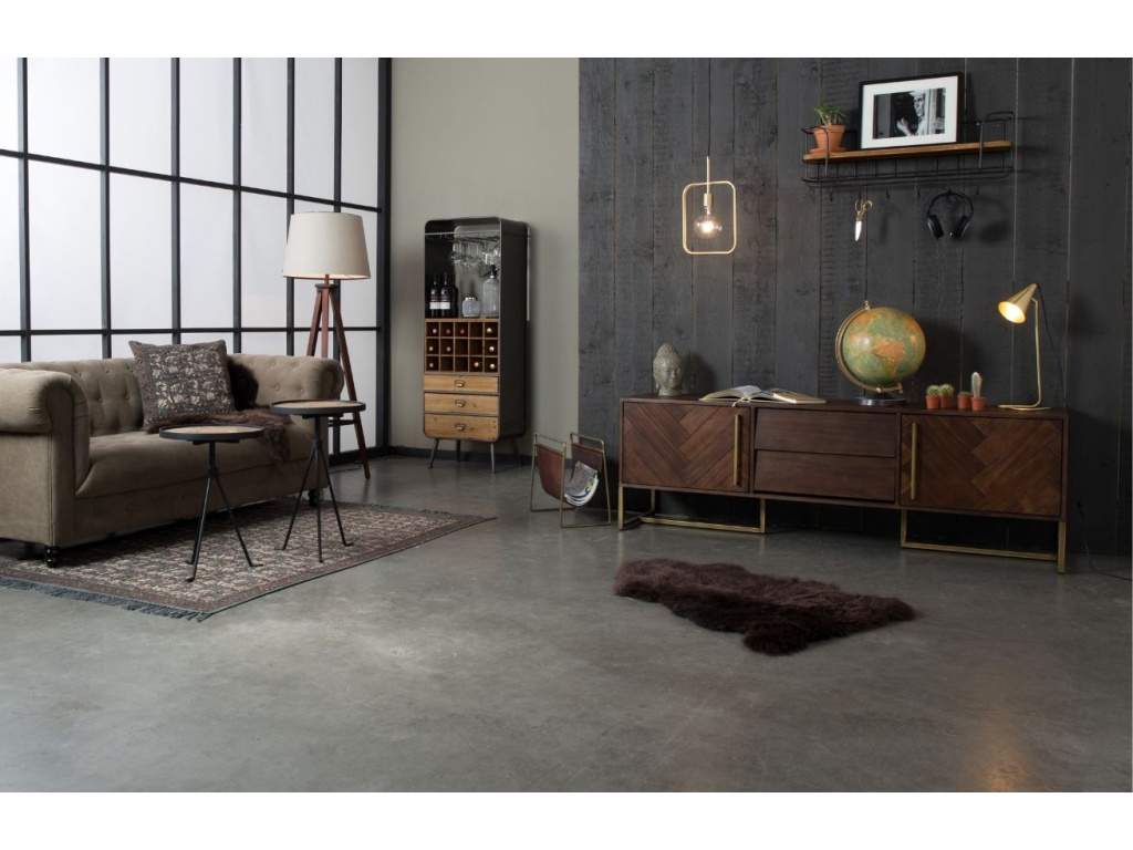 TV stolek Class značky DUTCHBONE je navržen ve vintage stylu a je opatřen elegantní kovovou podnoží v mosazné barvě. Korpus se vzorem rybích kostí je vyroben z akátové dýhy a je doplněn štíhlými kovovými úchytkami. Díky dvěma odklápěcím policím a dvěma bočním skříňkám vzniká prostorné úložiště, které jistě oceníte. Samozřejmostí je otvor na kabely, který využijete při zapojování herních konzolí a přehrávačů. V sérii produktů Class najdete komody a stoly různých velikostí, které vám pomohou dokonale sladit interiér.
