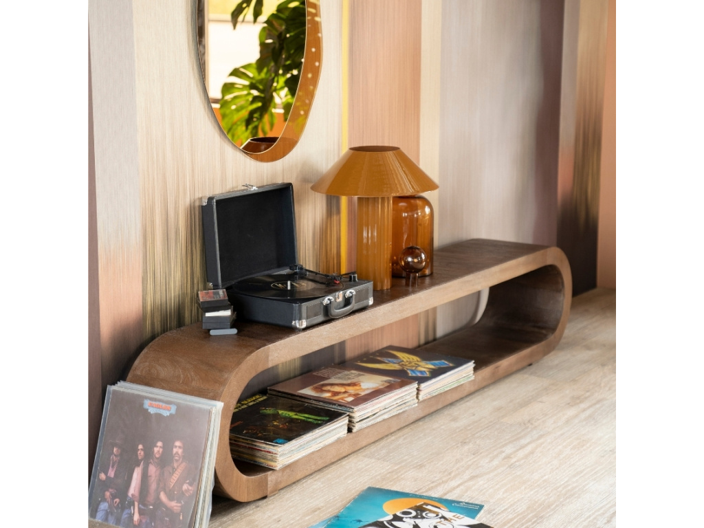 TV stolek Elora z mangového dřeva je dokonalým spojením moderního minimalismu a retro stylu. Jeho zaoblené linie a přírodní materiál vnesou do každého interiéru nádech nadčasové elegance. Stolek je ideální nejen pro umístění televize, ale díky své otevřené konstrukci a prostorné odkládací ploše nabízí místo pro dekorace, vinylové desky či designové doplňky. Kombinace teplého dřeva a sofistikovaného designu z něj dělá univerzální kousek, který vynikne jak v moderních, tak i klasicky laděných prostorech. Investujte do nábytku, který podtrhne váš vytříbený styl a přinese do vašeho domova útulnou atmosféru.