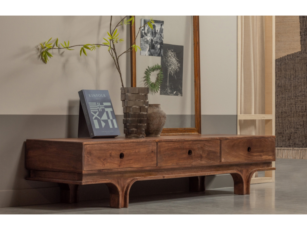 Hledáte něco klasického, ale současně atraktivního? Tento televizní stolek Esta od značky Hoorns je výbornou volbou. Ihned si ho zamilujete pro jeho přiznanou přírodní kresbu mangového dřeva, které se řadí mezi nejtvrdší druhy na světě, a tak vám TV stolek nepochybně dlouho vydrží. Ve třech zásuvkách je dostatek místa pro uložení nevzhledných kabelů a dalších předmětů. Svým tradičním vzhledem se bude hodit do všech klasicky zařízených interiérů a bude se vám snadno kombinovat s ostatním dřevěným nábytkem, popřípadě s dalšími přírodními materiály. Současně bude vypadat skvěle i v interiérech v japonském stylu.