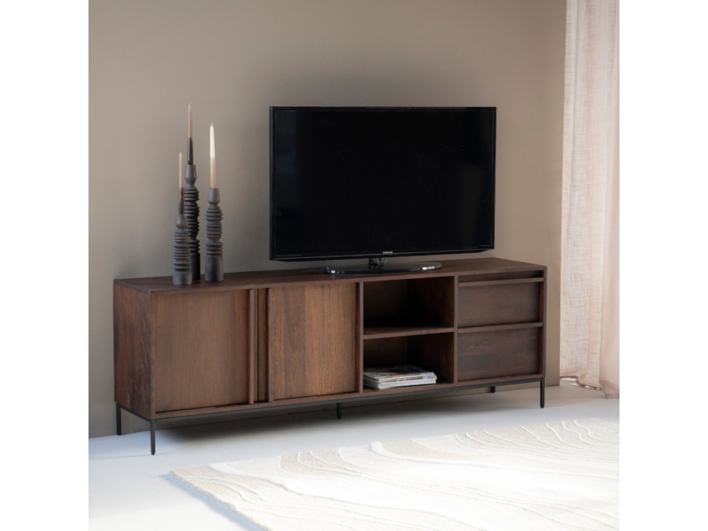 Televizní stolek Jimmy od značky Eleonora se stane jedinečným a stylovým doplňkem vašeho domova. Stolek je vyrobený z mangového dřeva, které v kombinaci s černě lakovanou kovovou podnoží a minimalistickým designem, vytváří lehký a elegantní dojem. Jimmy disponuje čtyřmi policemi a dvěma zásuvkami, které poskytují dostatek úložného prostoru pro veškeré drobnosti, knihy či elektroniku. Hodí se nejen do obývacího pokoje, ale skvěle poslouží i v chodbě nebo ložnici. Pro dokonale sladěný interiér si můžete pořídit také komodu Jimmy, která rozšíří možnosti uspořádání a doladí váš prostor.
