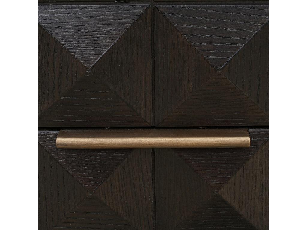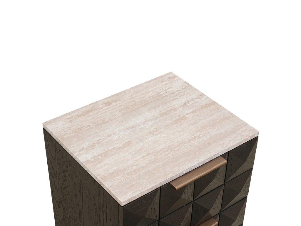 Noční stolek Claremont spojuje praktickou funkci s výrazným designem. Jeho dubová konstrukce s pyramidovým vzorem a mosaznými úchytkami působí noblesně a horní deska z béžového kamene mu dodává přírodní nádech. Dvě prostorné zásuvky poskytují dostatek místa na všechny vaše nezbytnosti. Tento stolek je dokonalým doplňkem luxusních a elegantních ložnic. Celou kolekci Claremont lze kombinovat pro ucelený vzhled a harmonický vzhled interiéru.
