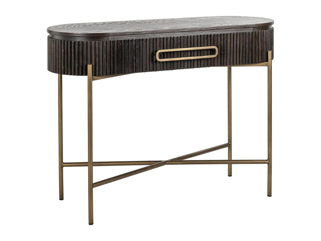 Toaletní stolek Luxor od značky Richmond se zásuvkou je stylový a praktický kousek, který je ideální pro použití v různých místnostech vašeho domova. Díky svým rozměrům nabízí tento stolek dostatečný prostor pro různé účely. Podnož s mosaznou povrchovou úpravou přidává na eleganci a sofistikovanosti, stejně tak mosazné madlo zásuvky. Zásuvka nabízí dodatečný úložný prostor na předměty, které nechcete mít na očích. Hladkou desku stolu z tmavé dubové dýhy lze využít k prezentaci dekorací, obrazů, svíček a podobných předmětů. Rovněž se dá použít jako kosmetický stolek.