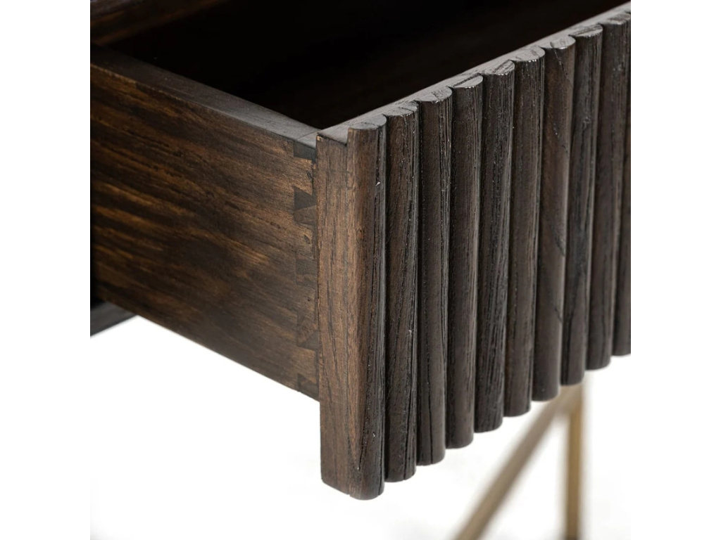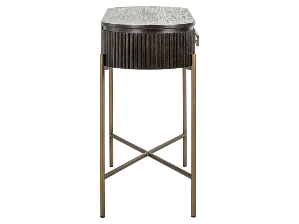 Toaletní stolek Luxor od značky Richmond se zásuvkou je stylový a praktický kousek, který je ideální pro použití v různých místnostech vašeho domova. Díky svým rozměrům nabízí tento stolek dostatečný prostor pro různé účely. Podnož s mosaznou povrchovou úpravou přidává na eleganci a sofistikovanosti, stejně tak mosazné madlo zásuvky. Zásuvka nabízí dodatečný úložný prostor na předměty, které nechcete mít na očích. Hladkou desku stolu z tmavé dubové dýhy lze využít k prezentaci dekorací, obrazů, svíček a podobných předmětů. Rovněž se dá použít jako kosmetický stolek.