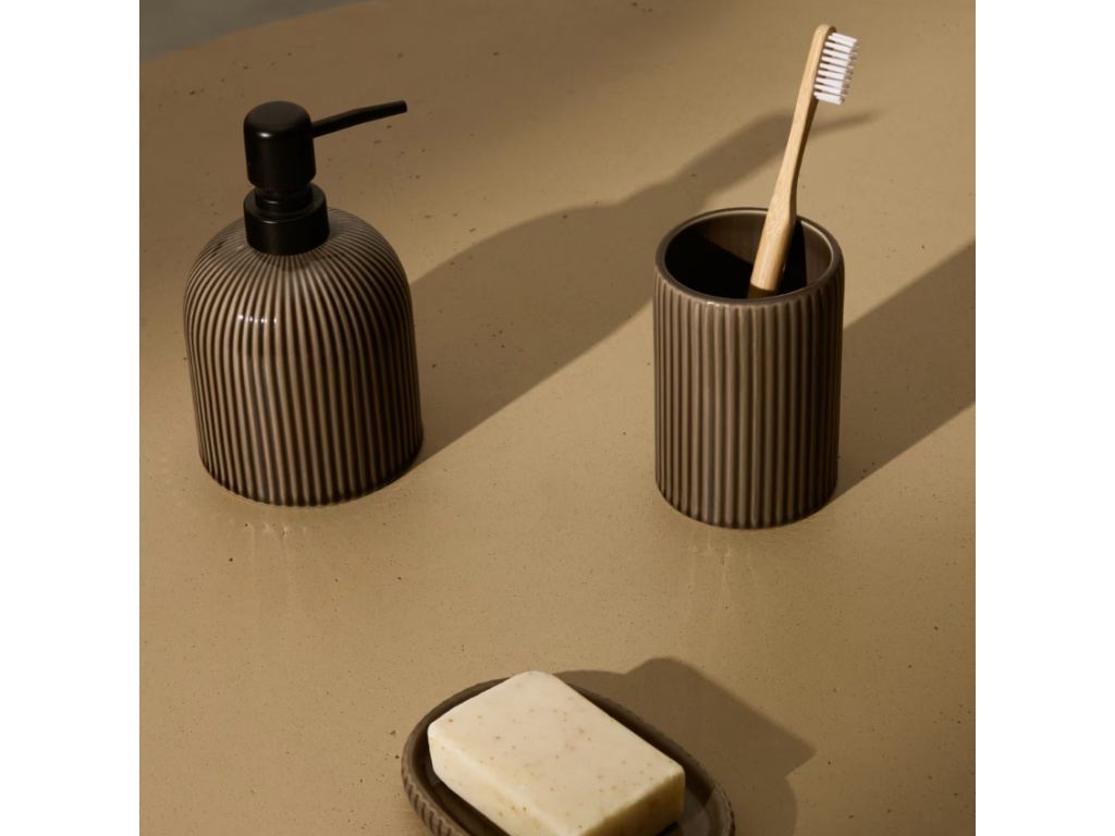 Série koupelnových doplňků Selime je důkazem, že i ty nejmenší detaily můžou udělat velký dojem. Kamenina s hnědou glazurou, jemně zaoblené tvary a nadčasový minimalistický design vytvářejí dojem klidu a přirozené elegance – přesně takový, jaký chceme cítit každé ráno i večer. Série zahrnuje misku na mýdlo, dávkovač, stojan na kartáčky i WC štětku – každý kus samostatně funkční, ale dohromady tvoří promyšlený a stylově sladěný celek. Selime je ideální pro ty, kteří chtějí proměnit každodenní rutinu v malý rituál krásy a péče – v prostředí, které působí čistě, útulně a vyváženě.