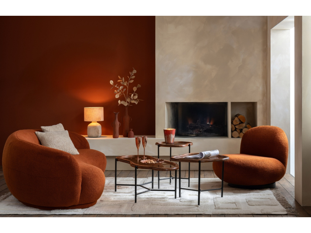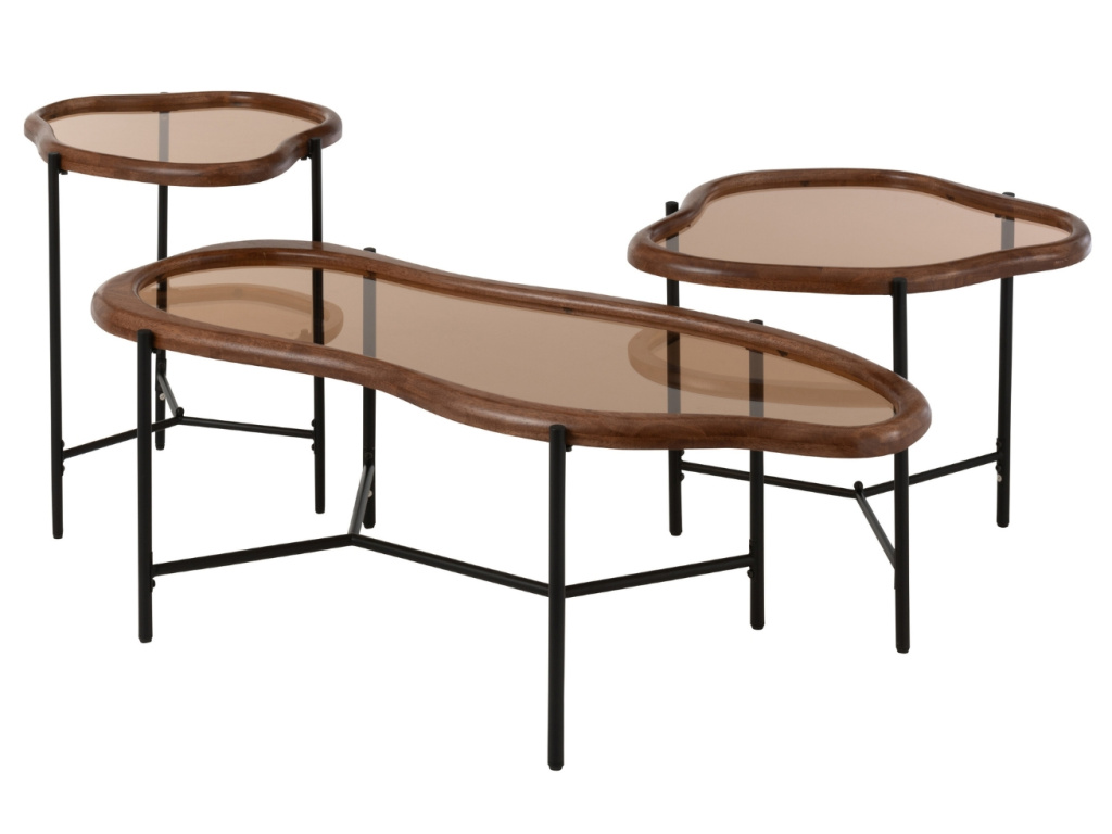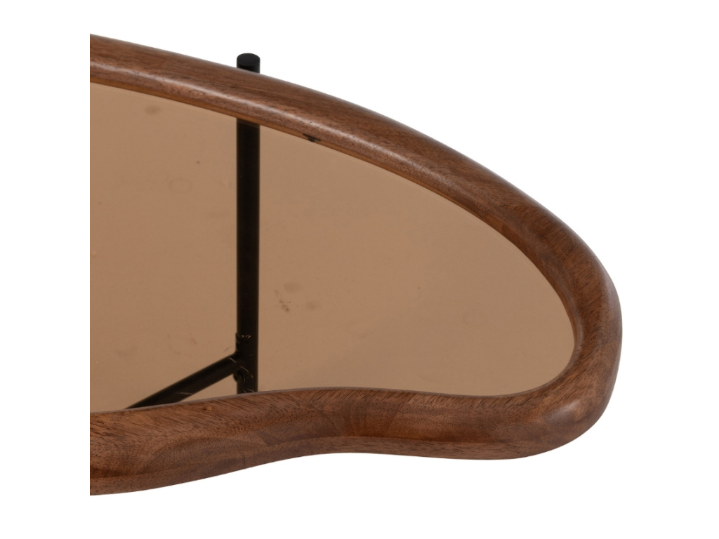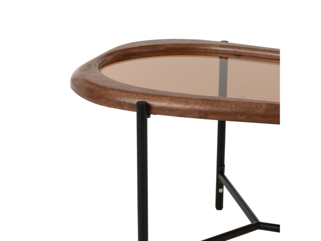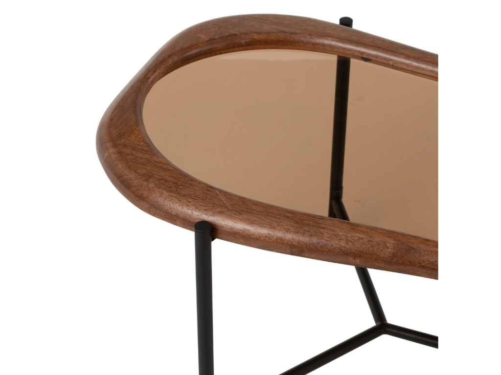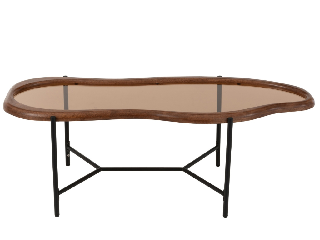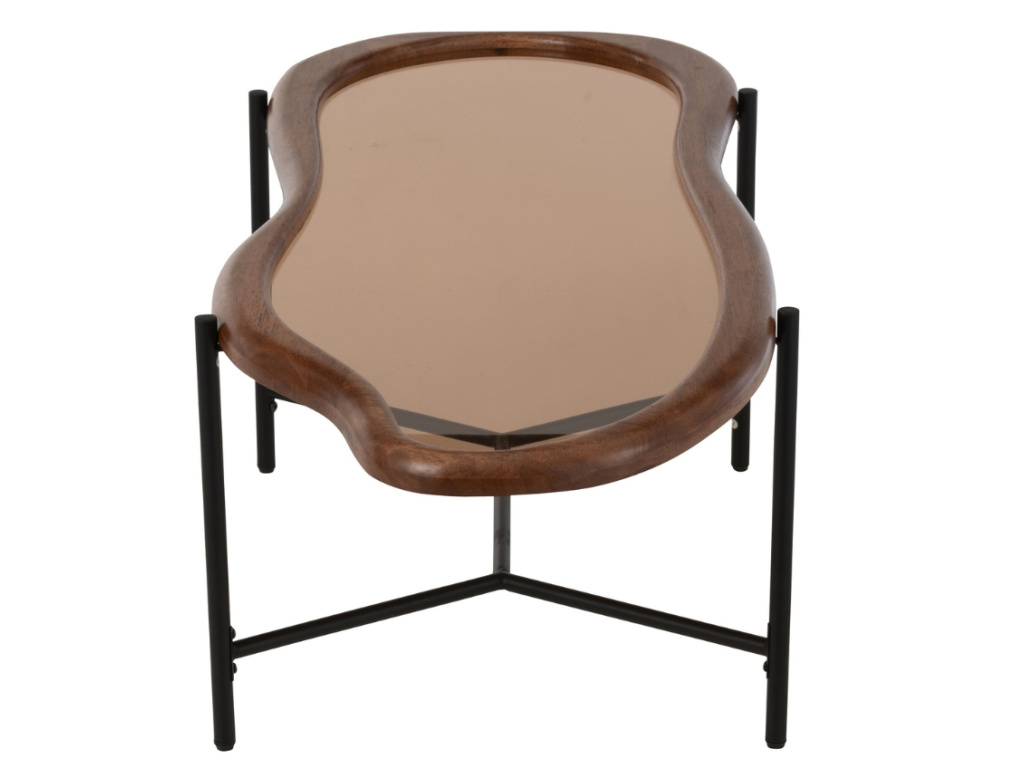 Konferenční stolek Mell přináší do obývacího pokoje harmonii tvarů. Jeho elegantní, organicky tvarovaná deska z tónovaného skla v dřevěném rámu působí jako umělecký objekt. Spojení s černou kovovou podnoží dodává stolku moderní a lehce industriální výraz. Jemně zvlněný tvar vytváří vizuálně zajímavý kontrast k přímým liniím nábytku. Díky větším rozměrům je ideální jako centrální prvek před sedačkou a poskytne dostatek místa pro kávu, občerstvení i designové doplňky. Tento kousek je perfektní volbou pro ty, kdo hledají něco nevšedního, ale stále vkusného.