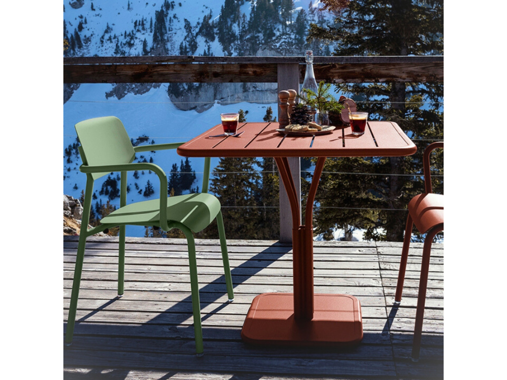 Zahradní stůl od značky Fermob pochází z ikonické kolekce Luxembourg, která je typická pro lamelový design a trendy odstíny. Má kompaktní rozměry, takže je ideální na zahrádku restaurace i na malý balkón. Hliníková podnož se skládá ze čtyř trubek, které se sbíhají do jednoho celku, což samo o sobě vytváří zajímavý prvek, a čtvercový podstavec zajišťuje výbornou stabilitu celého stolu. Uprostřed lamelové desky má díru na slunečník, který dopřeje komfort během slunných dnů. Vyrábí se z prvotřídních materiálů a je testován tak, aby splňoval standardy kvality evropských norem (NF EN 581-1 a NF EN 581-2). Exkluzivní systém antikorozní úpravy pro venkovní použití a anti-UV práškový lak (standardizované testy AFNOR) dělají ze stolu unikátní kousek zahradního nábytku, který lze variabilně kombinovat s dalšími produkty z řady Luxembourg, se kterými velice snadno vytvoříte atmosféru pařížských kaváren.