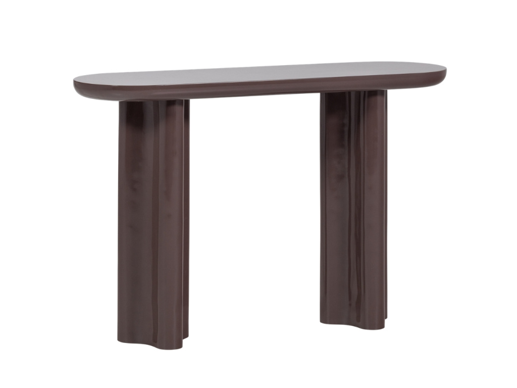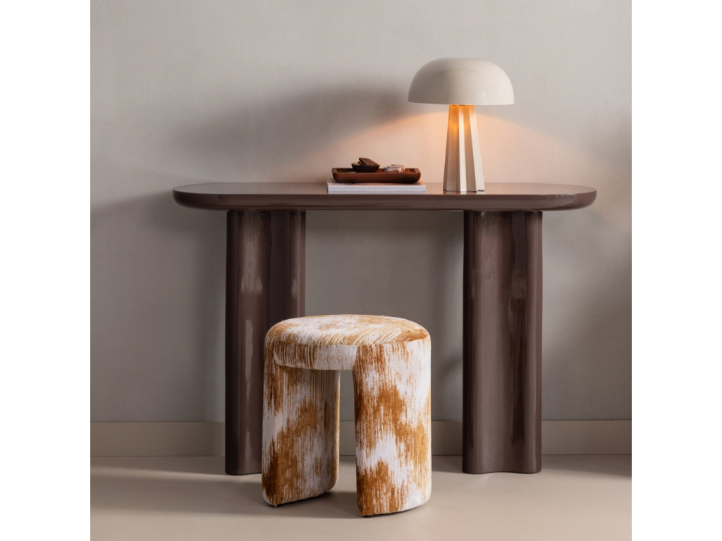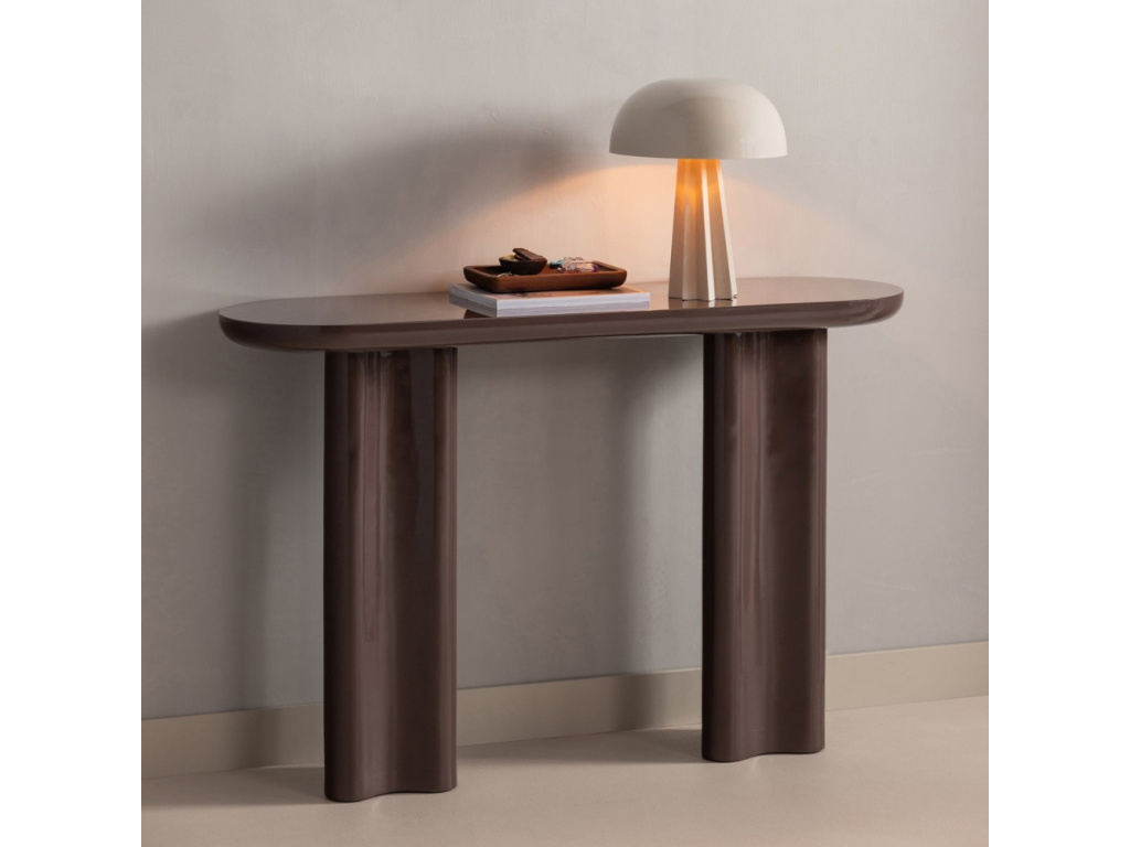 Toaletní stolek Evara se stane výrazným prvkem vašeho domova díky svému hladkému povrchu ve vysokém lesku a tmavě hnědé barvě. Jeho moderní válcovitý tvar působí v prostoru velmi čistě a elegantně, zatímco tmavý odstín dodává interiéru hloubku. Tento stylový solitér se výborně hodí do minimalistických prostorů nebo bytů laděných do moderního městského stylu, kde vynikne jeho zářivý povrch a minimalistický design.