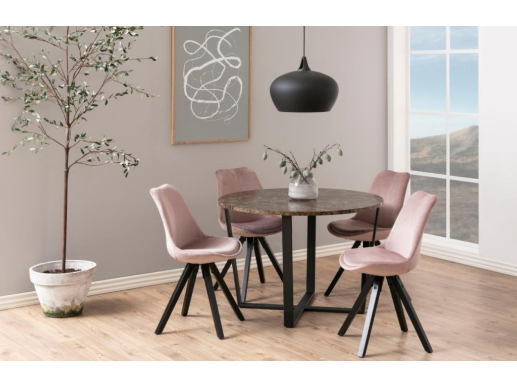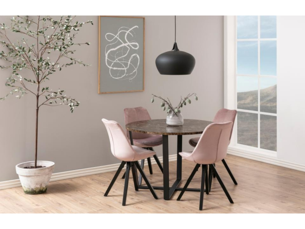 Styl, elegance a originalita. To jsou hlavní vlastnosti jídelního stolu Calvin. Melaminová deska s mramorovým povrchem v hnědém odstínu a křížená kovová podnož společně vytváří unikátní kontrast, který rozjasní každou vaši chvíli při snídani, obědě či večeři. Díky této kombinaci se hodí do moderních, ale zároveň i klasických interiérů.