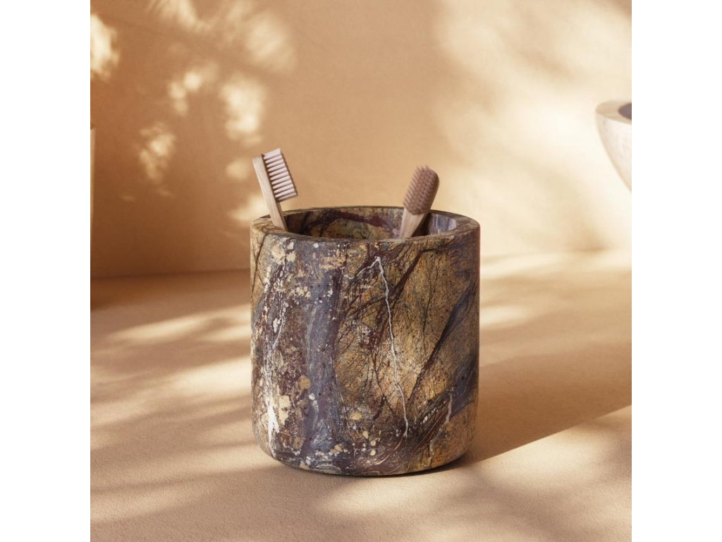 Jedinečná textura mramorového stojanu Spalsh je krásným prvkem do každé koupelny. Kelímek na zubní kartáčky od značky Kave Home je z nové exkluzivní kolekce. Krásné přírodní tóny stojanu, který je vyroben z jednoho kusu kamene, zaujmou a doladí celý interiér.