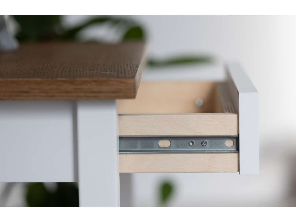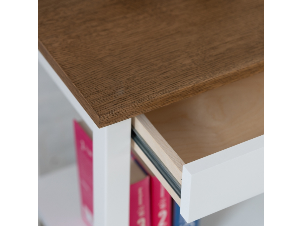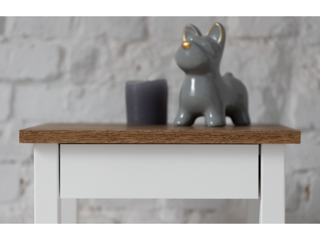 RAGABA ENTLIK je praktickým stolkem do domácnosti v čistém jednoduchém designu. Deska stolku je vyrobena z dubové dýhy a doplňuje ji vysoká podnož z bukového masivu. Výhodou stolku je nenápadná zásuvka, která však poskytne dostatečné úložiště na vaše drobnosti. Zásuvka je opatřena tlumičem, proto se nemusíte bát případných nárazů nebo brzkého opotřebení. Praktickým prvkem je také police, kam můžete umístit oblíbené knihy či dekorace a květiny. Stolek bude skvělým doplňkem do obývacího pokoje i jako noční stolek do ložnice.