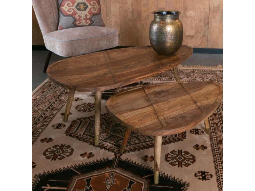 Set hnědých konferenčních stolků Sham vytvořený tak, aby připomínal tvar kapiček. Řemeslníci vyrábějí tento set ručně a vynakládají co největší úsilí v unikátních řezbách na vrcholu desek. Sham je vyrobený z indického sheeshamového dřeva známého svojí výdrží, tvrdostí a překrásnými plamennými vzory. Podnož ze stejného materiálového provedení zaručuje perfektní stabilitu a elegantní vzhled díky lakované spodní části lakované mosaznou barvou.