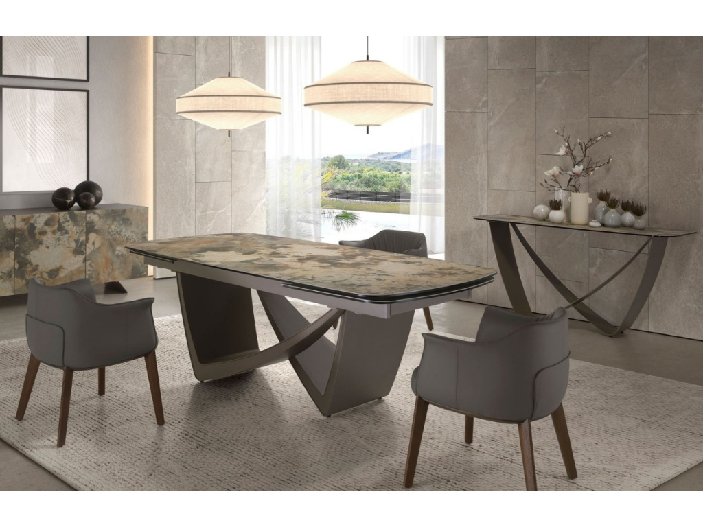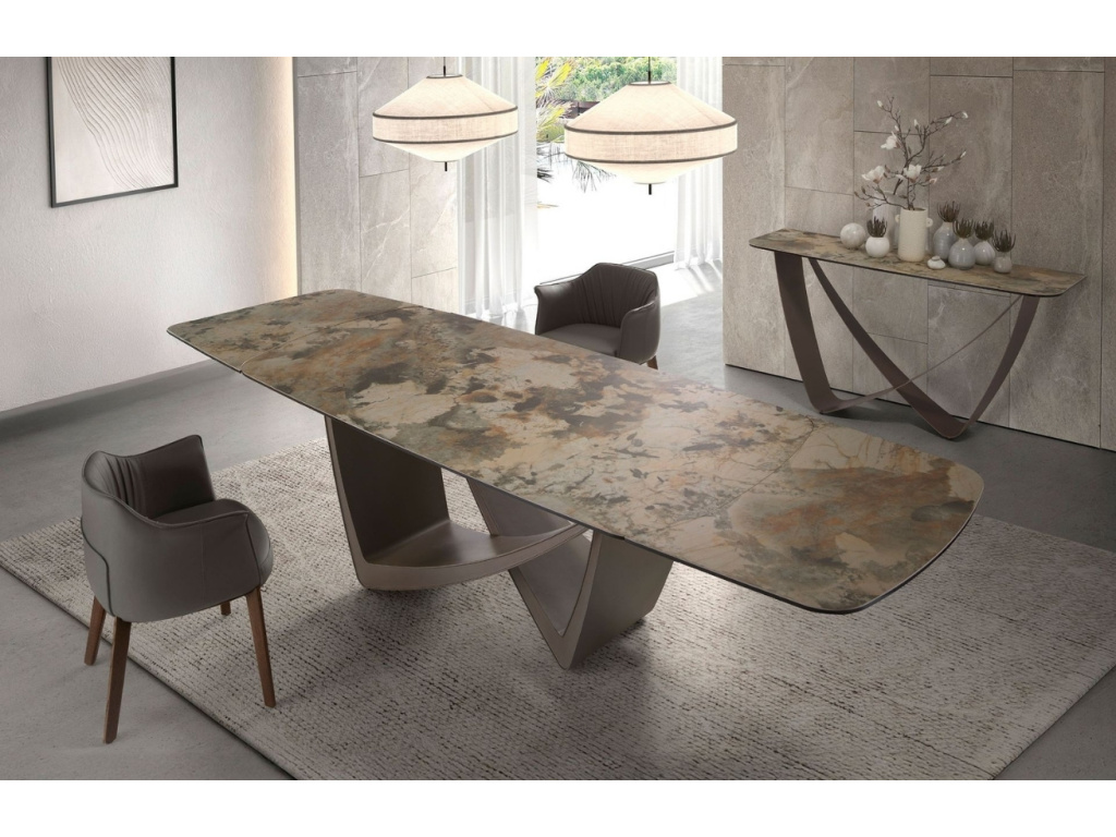 Tento toaletní stolek v sobě snoubí jednoduchý moderní design s výraznými prvky, které okamžitě upoutají pozornost. Deska z porcelánového mramoru v zemitých a šedých tónech dodá vašemu prostoru jemný dotek elegance a přirozenosti. Netradičně tvarovaná lakovaná kovová podnož podtrhuje jeho jedinečný charakter. Stolek skvěle poslouží v ložnici, předsíni či obývacím pokoji, kde vytvoří praktický odkládací prostor s nádechem stylového luxusu.