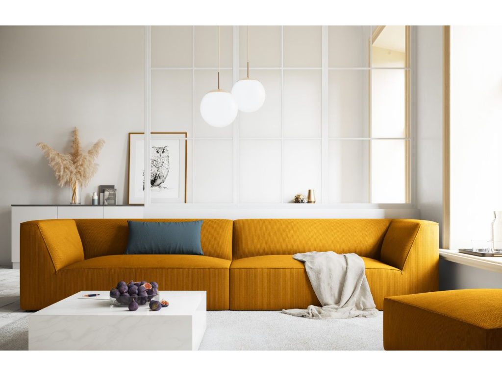 Čtyřmístná pohovka Ruby od společnosti Micadoni se stane příjemným doplňkem vašeho obývacího pokoje. Matná manšestrová tkanina, se strukturovaným dekorem v podobě proužků, je velmi příjemná na dotek. Látka je pokryta hydrofobní vrstvou, která chrání před rychlou absorpcí rozlité kapaliny do struktury nábytku. Navíc disponuje vysokou odolností proti oděru. Kombinací různých modulů a velikostí pohovky si můžete vytvořit konfigurace sezení podle svých představ. Sezení Ruby doporučujeme spojit s jednoduchým konferenčním stolkem, na který můžete umístit svíčky, dekorace nebo občerstvení. Díky tomu získáte jednoduchou, ale sofistikovanou skandinávskou obývací sestavu.