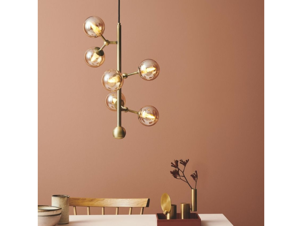 Elegantní vertikální závěsné světlo Atom značky Halo Design na první pohled zaujme svým jedinečným designem. Transparentní jantarově hnědá skleněná stínidla jsou umístěna na kovových ramenech, která jsou pohyblivá. Díky nim lze světlo upravit přesně podle vašich představ a osvětlení tak získá na výjimečnosti a originalitě. Světlo Atom je k dispozici v několika barevných variantách, díky čemuž se snadno přizpůsobí každému interiéru. Skvěle vynikne v moderních interiérech komerčních i nekomerčních prostor.
