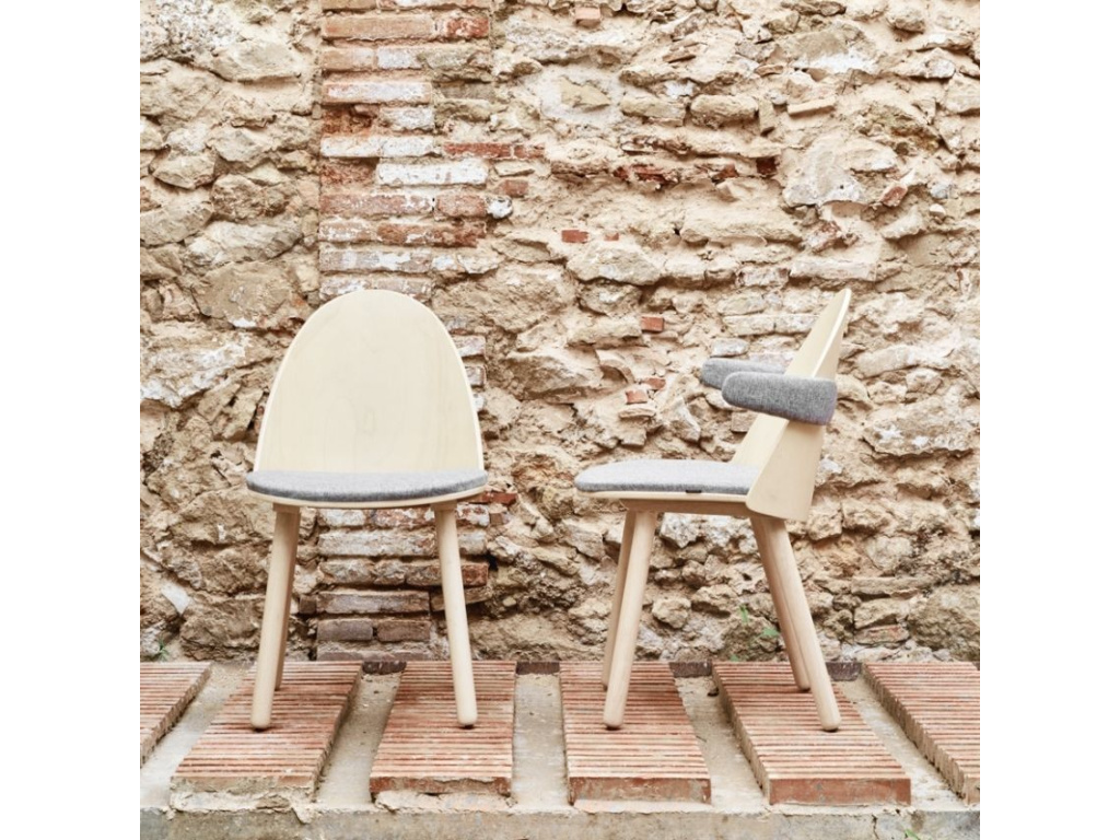 Teulat Uma je moderní jídelní židle v přírodním barevném odstínu, která je vhodná nejen do jídelních koutů a kuchyní, ale najde své uplatnění i ve veřejných prostorech různorodé funkce, kam vnese závan svěžího stylu. Design židle zaujme svými zaoblenými a minimalistickými tvary sedáku a pohodlných područek. Sedák židle je vyroben z jasanové překližky a podsedák i područky mají látkové čalounění. Stabilní podnož je z lakovaného masivního dřeva.